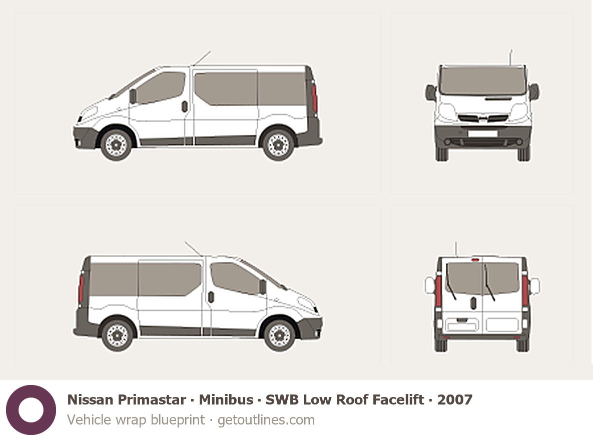 This 2007 Nissan Primastar Minibus SWB Low Roof Facelift Bus blueprint helps designers, wrap studios, and 3D artists simplify their workflow and save valuable time for creative work instead of routine tasks.