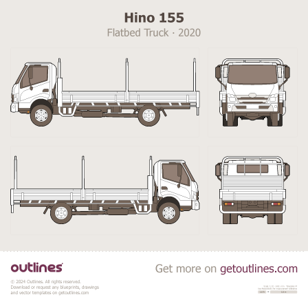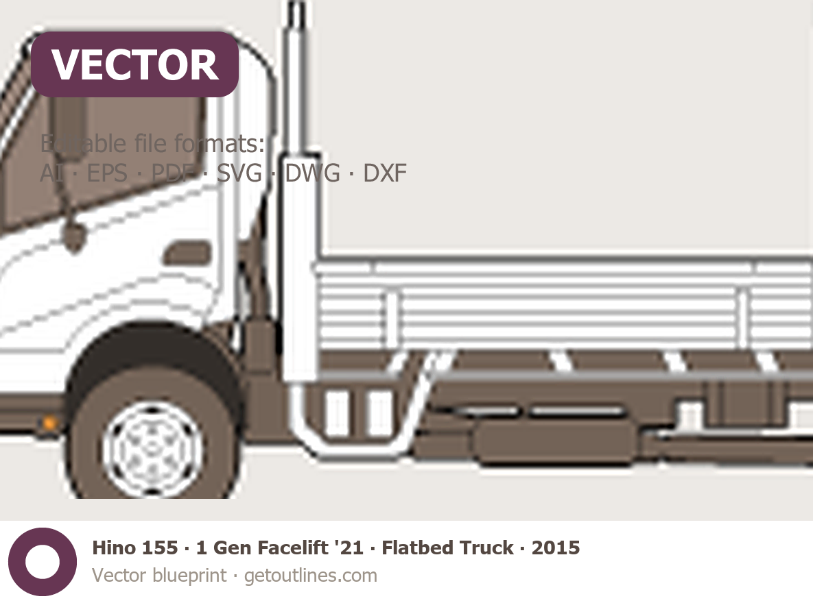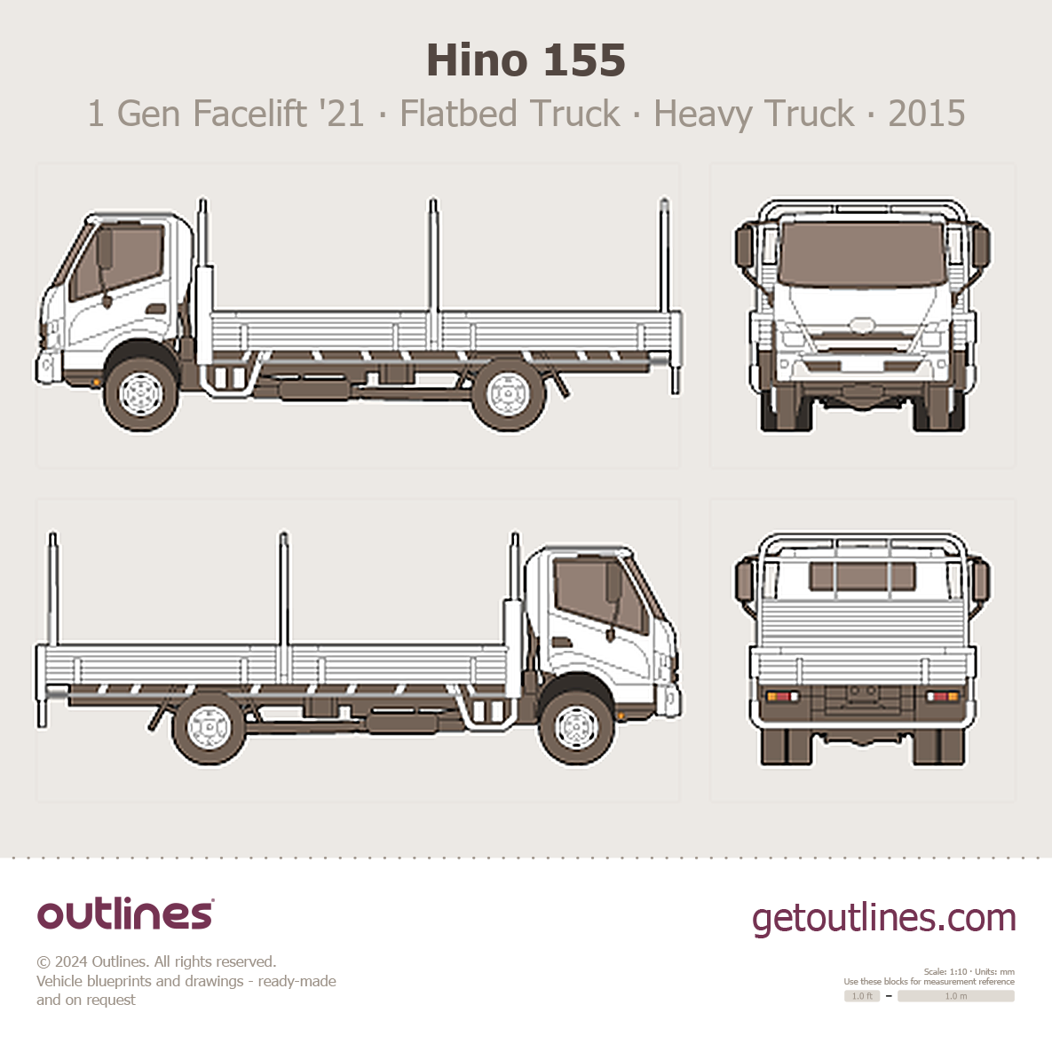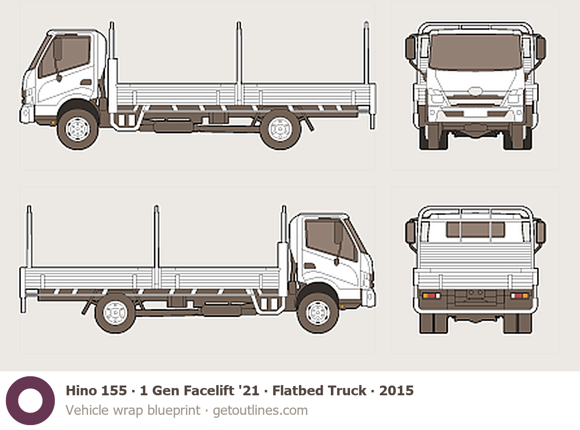 This 2015 Hino 155 1 Gen Facelift '21 Flatbed Truck Heavy Truck blueprint helps designers, wrap studios, and 3D artists simplify their workflow and save valuable time for creative work instead of routine tasks.