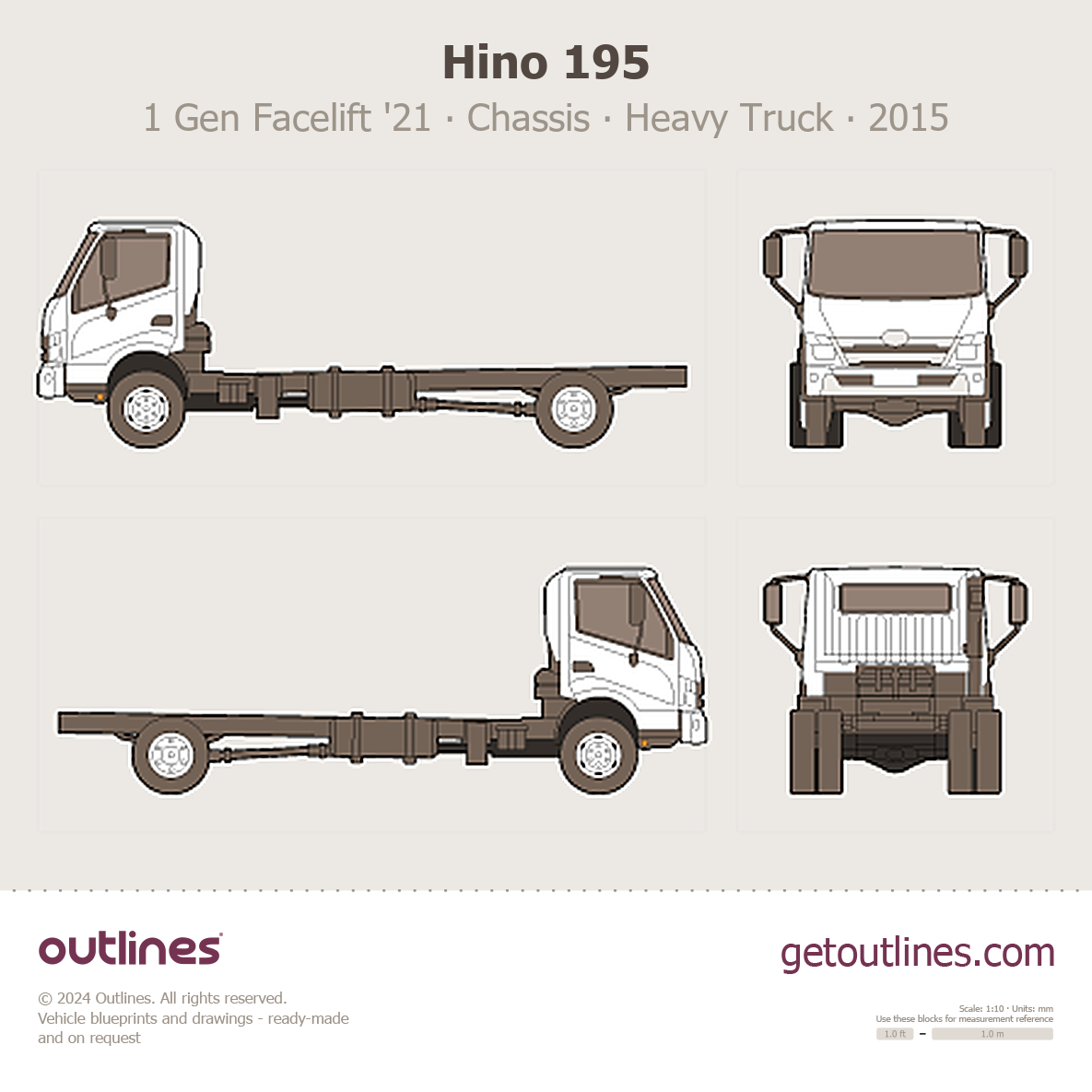 This is a blueprint of the 195, produced by carmaker Hino in 2015 - 2025. It features a Heavy Truck body design and is classified as a Commercial vehicle.