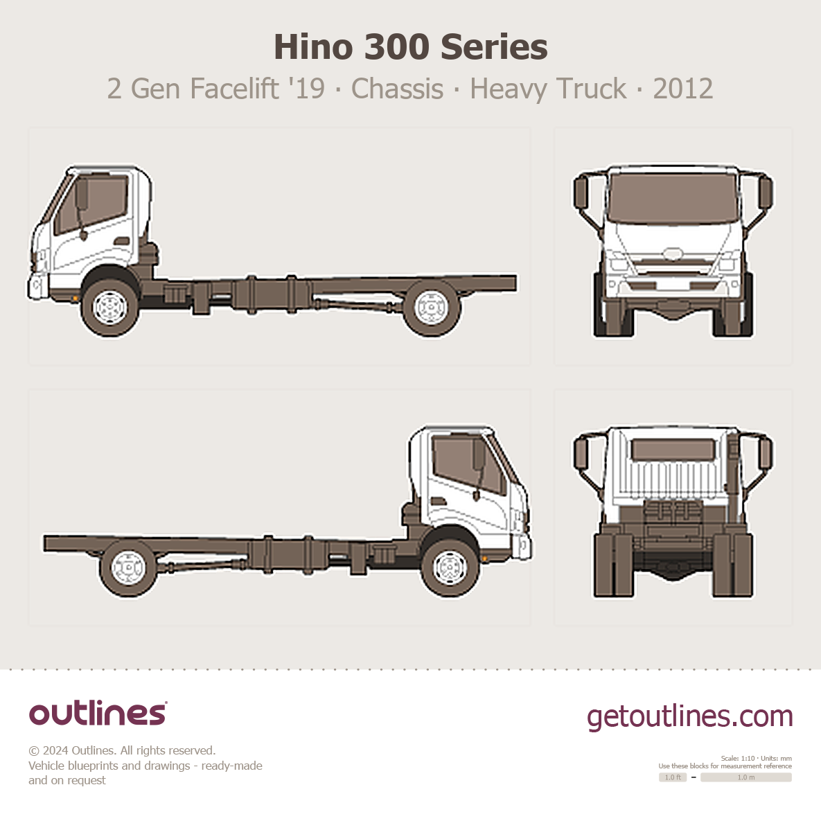 This 2012 Hino 300 Series 2 Gen Facelift '19 Chassis Heavy Truck blueprint helps designers, wrap studios, and 3D artists simplify their workflow and save valuable time for creative work instead of routine tasks.