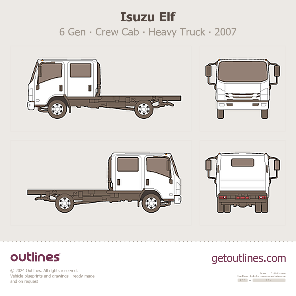 This 2007 Isuzu Elf 6 Gen Crew Cab Heavy Truck blueprint helps designers, wrap studios, and 3D artists simplify their workflow and save valuable time for creative work instead of routine tasks.