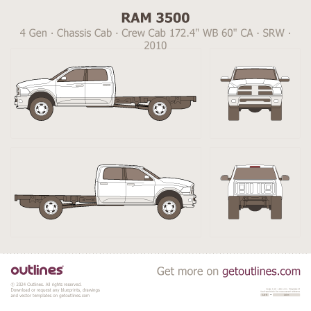 This 2010 Ram 3500 4 Gen Chassis Cab ∙ Crew Cab 172.4" WB 60" CA ∙ SRW Pickup Truck blueprint helps designers, wrap studios, and 3D artists simplify their workflow and save valuable time for creative work instead of routine tasks.