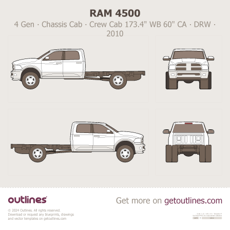 This 2010 Ram 4500 4 Gen Chassis Cab ∙ Crew Cab WB 173.4" CA 60" ∙ DRW Pickup Truck blueprint helps designers, wrap studios, and 3D artists simplify their workflow and save valuable time for creative work instead of routine tasks.