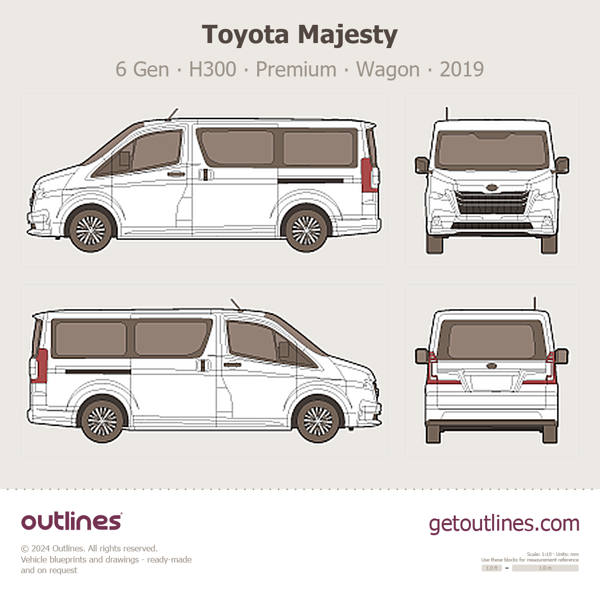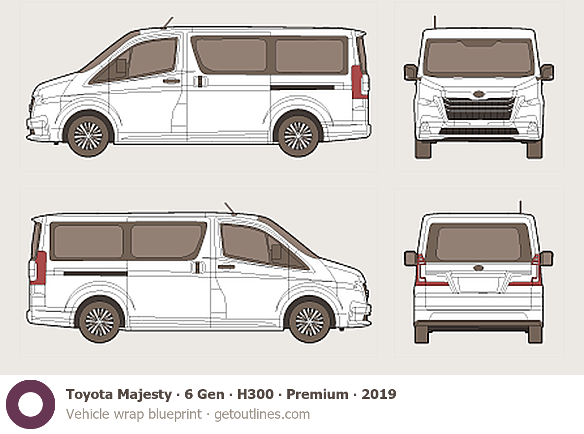 This 2019 Toyota Majesty 6 Gen ∙ H300 Premium Wagon blueprint helps designers, wrap studios, and 3D artists simplify their workflow and save valuable time for creative work instead of routine tasks.