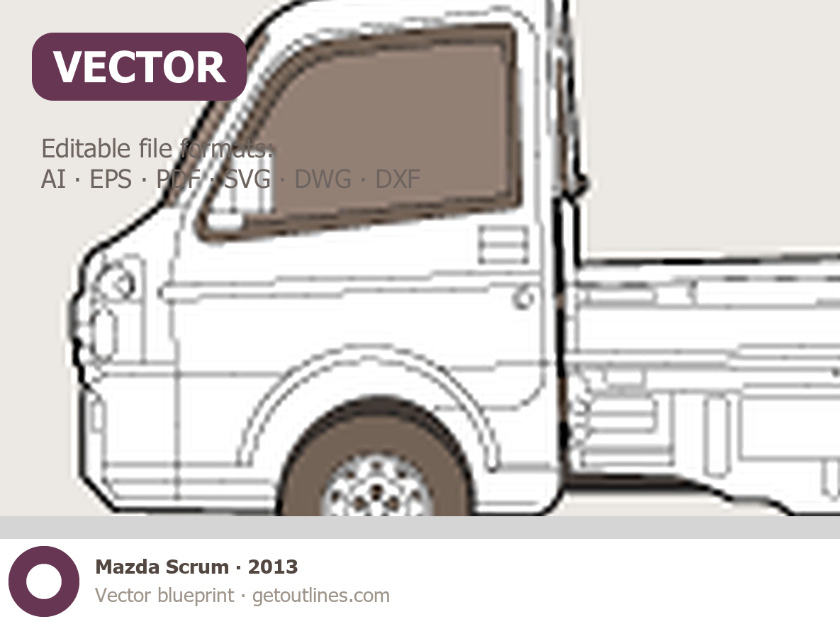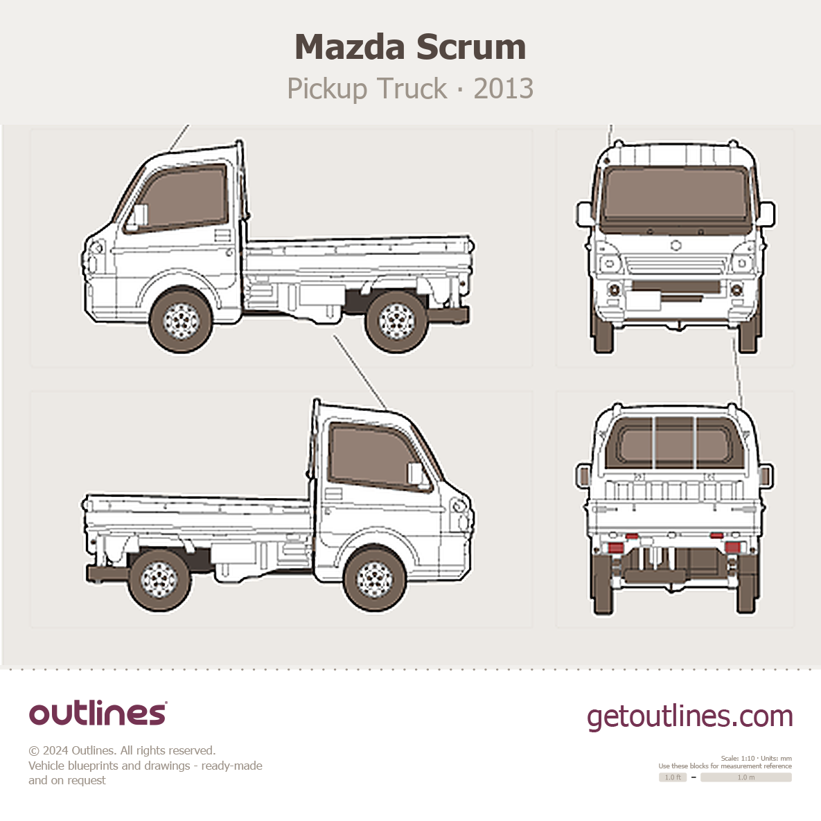 This 2013 Mazda Scrum Pickup Truck blueprint helps designers, wrap studios, and 3D artists simplify their workflow and save valuable time for creative work instead of routine tasks.