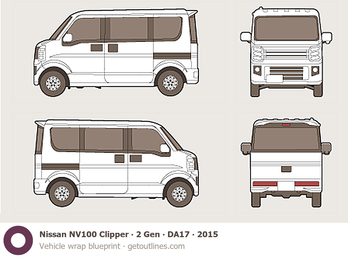 This 2015 Nissan NV100 Clipper 2 Gen ∙ DA17 Van blueprint helps designers, wrap studios, and 3D artists simplify their workflow and save valuable time for creative work instead of routine tasks.