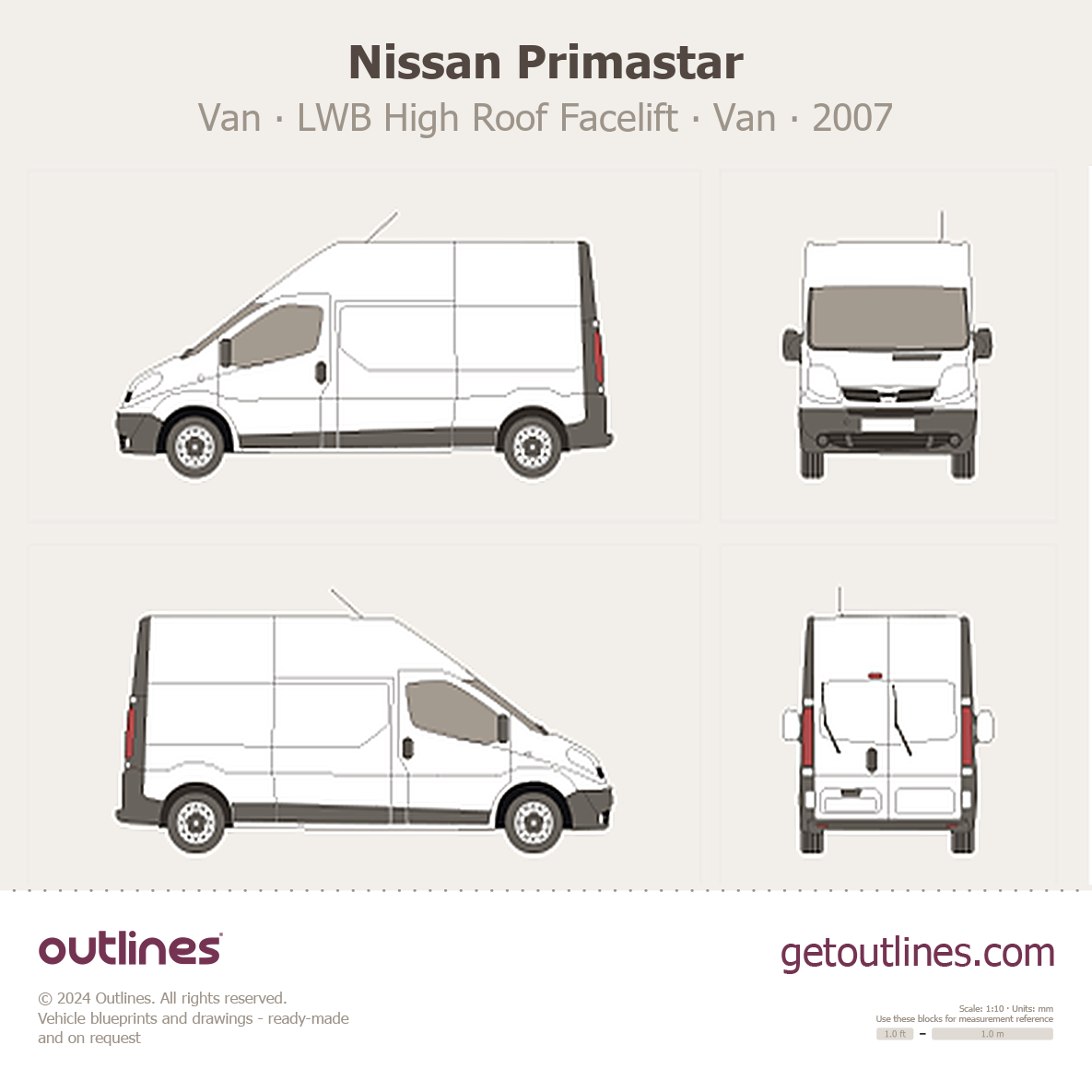 This 2007 Nissan Primastar Van LWB High Roof Facelift Van blueprint helps designers, wrap studios, and 3D artists simplify their workflow and save valuable time for creative work instead of routine tasks.
