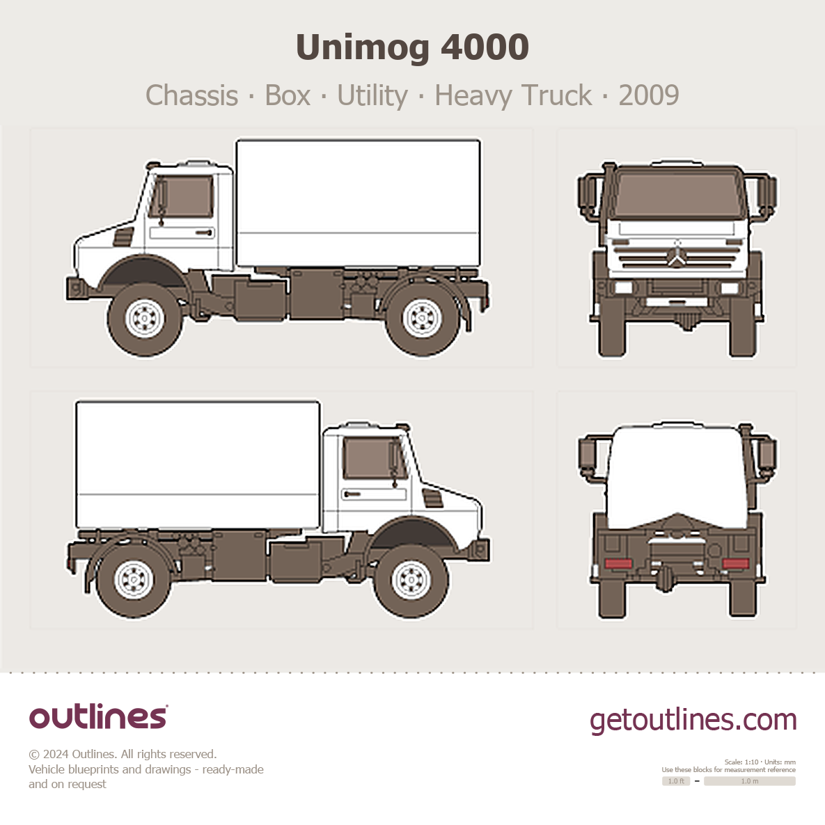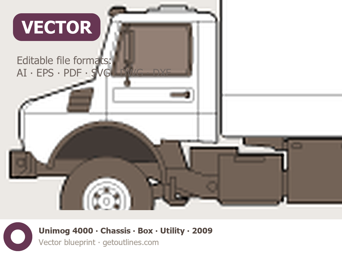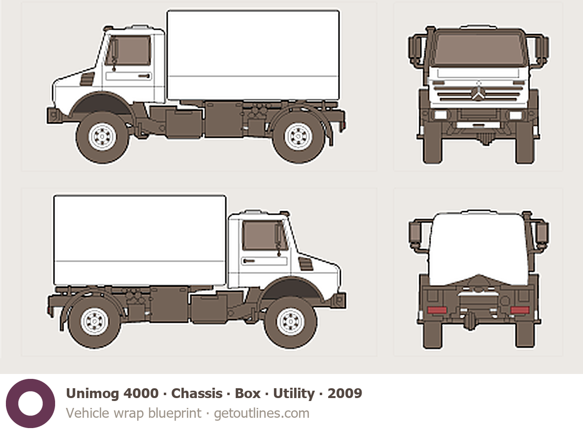 This 2009 Unimog 4000 Chassis ∙ Box ∙ Utility Heavy Truck blueprint helps designers, wrap studios, and 3D artists simplify their workflow and save valuable time for creative work instead of routine tasks.