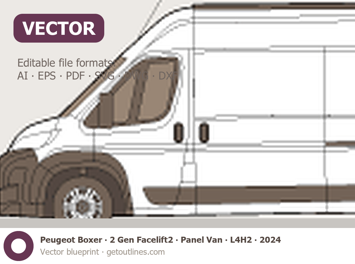 Buy this Peugeot Boxer 2 Gen Facelift2 blueprint and line drawing in high-quality editable vector file formats. Best for 3D and car wrap design.