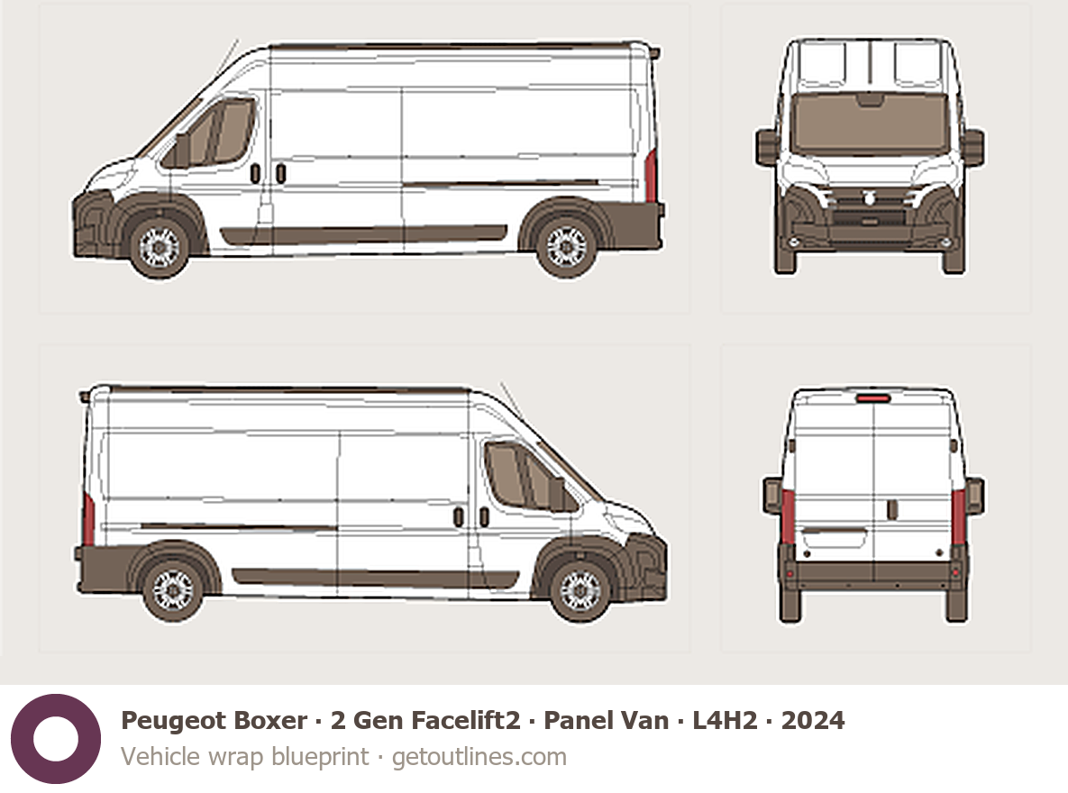 This 2024 Peugeot Boxer 2 Gen Facelift2 Panel Van ∙ L4H2 Van blueprint helps designers, wrap studios, and 3D artists simplify their workflow and save valuable time for creative work instead of routine tasks.