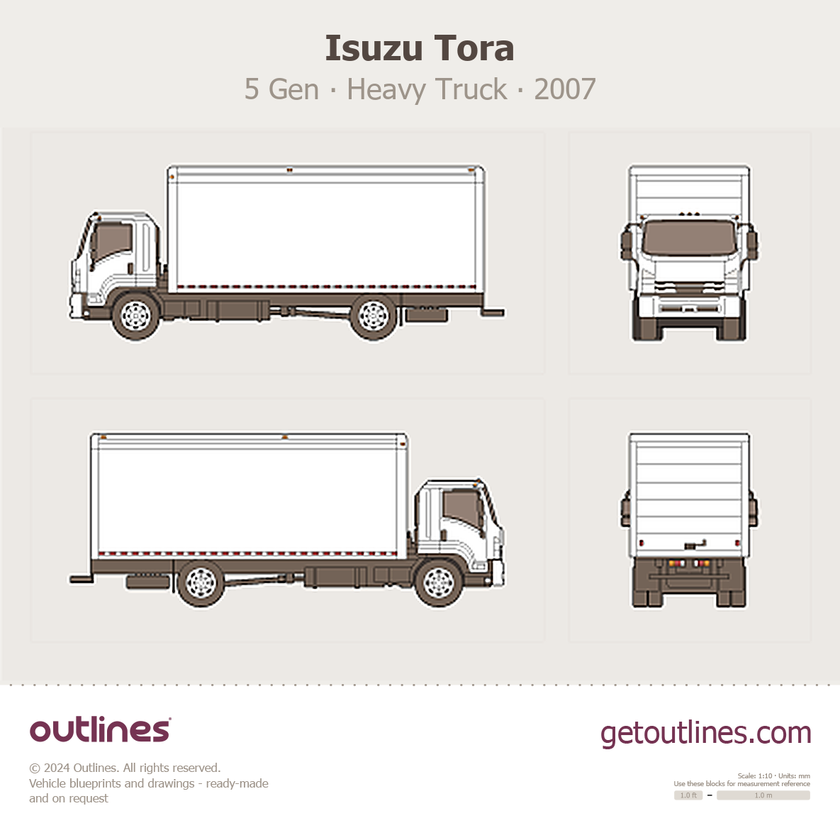 This is a blueprint of the Tora, produced by carmaker Isuzu in 2007 - 2022. It features a Heavy Truck body design and is classified as a Commercial vehicle.