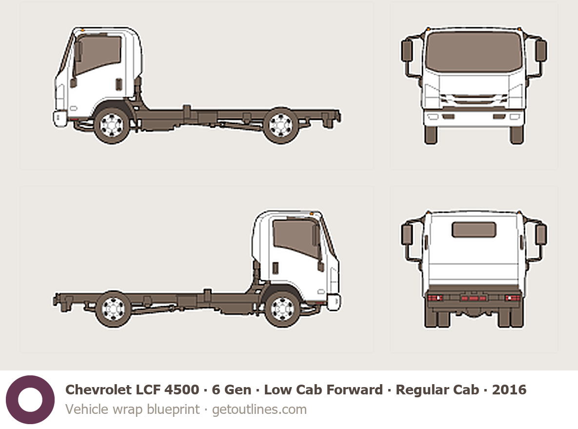 This 2016 Chevrolet LCF 4500 6 Gen ∙ Low Cab Forward Regular Cab Heavy Truck blueprint helps designers, wrap studios, and 3D artists simplify their workflow and save valuable time for creative work instead of routine tasks.