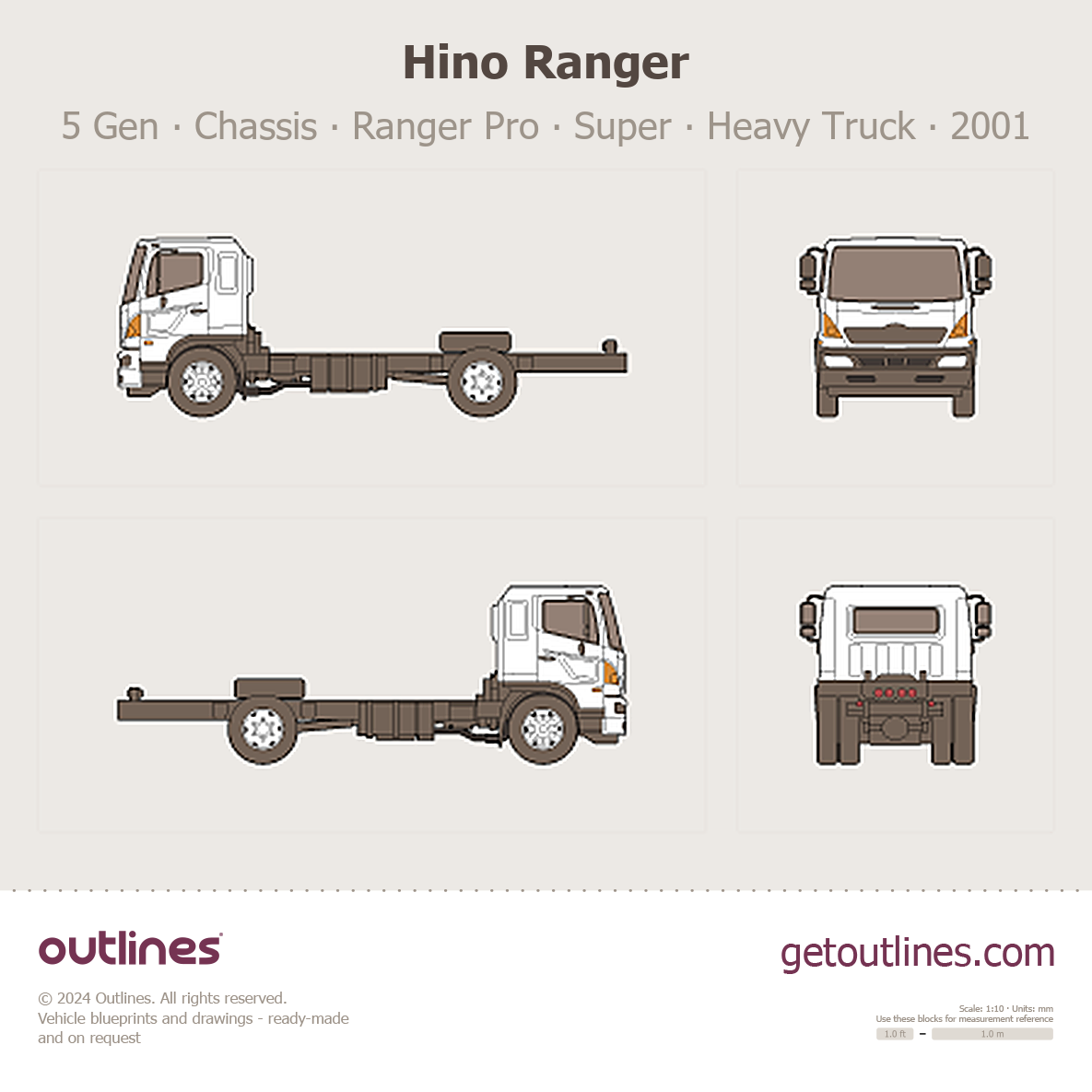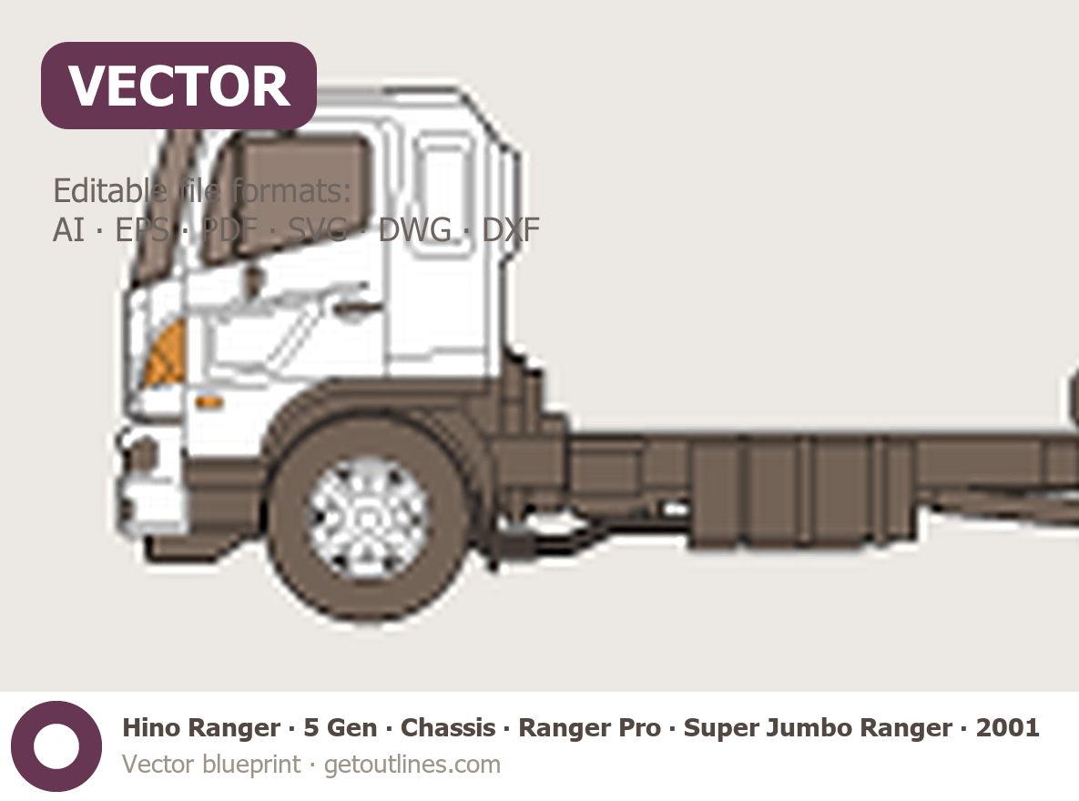 This 2001 Hino Ranger 5 Gen Chassis ∙ Ranger Pro ∙ Super Jumbo Ranger ∙ FC ∙ FD ∙ GD Heavy Truck blueprint helps designers, wrap studios, and 3D artists simplify their workflow and save valuable time for creative work instead of routine tasks.