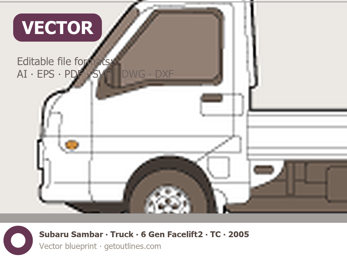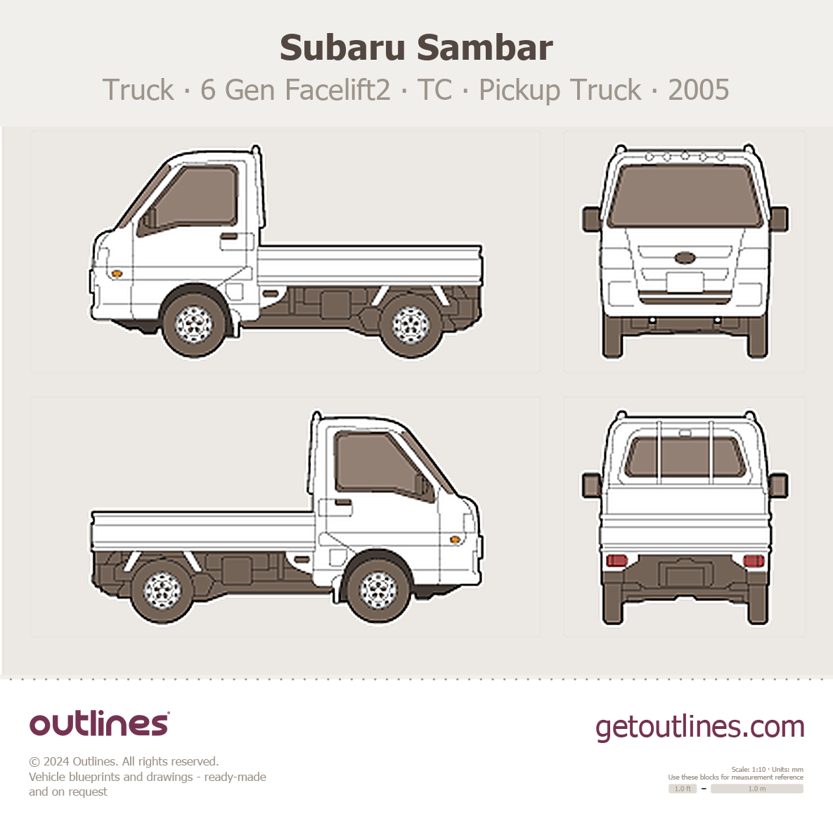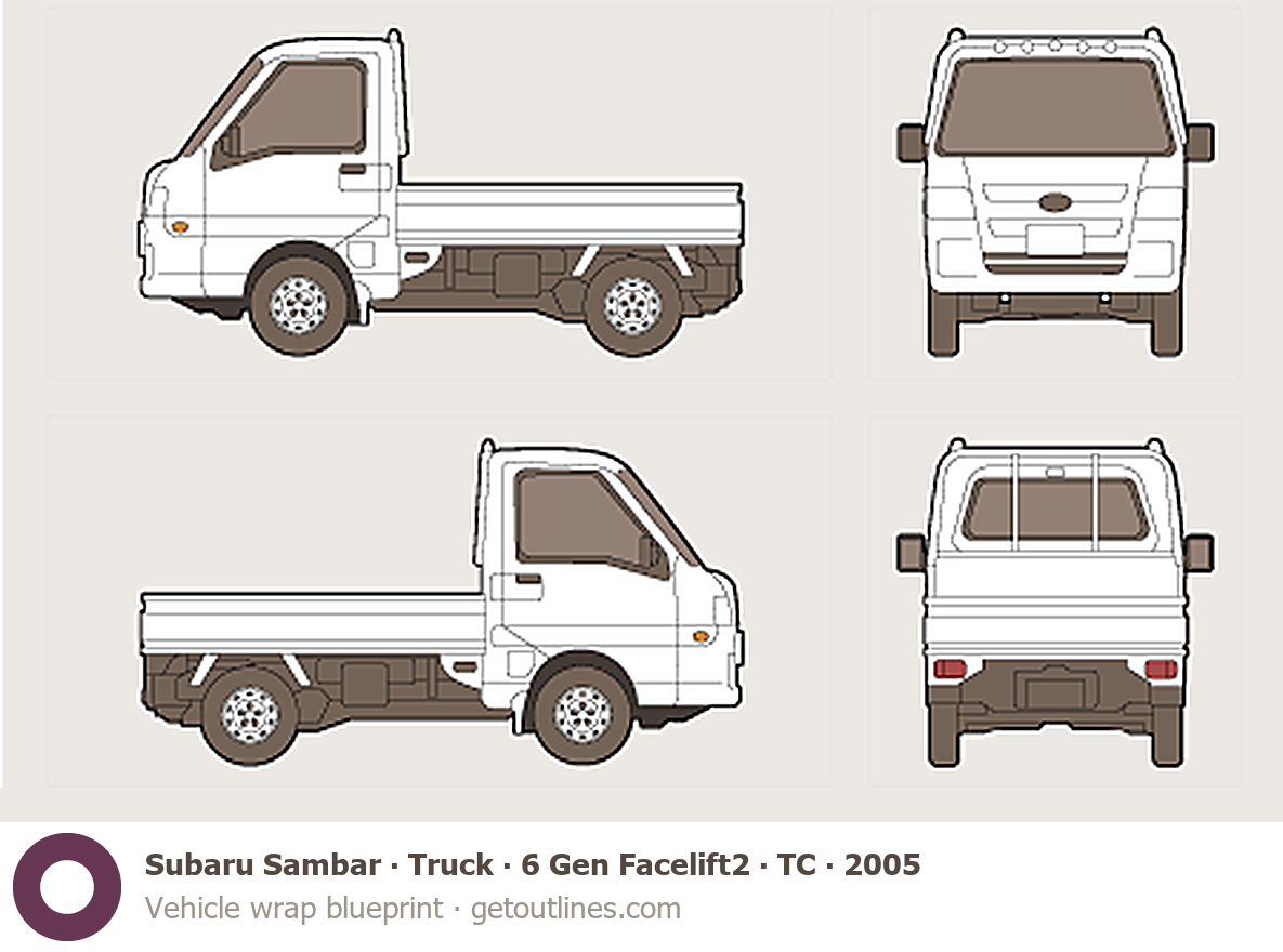 This 2005 Subaru Sambar Truck ∙ 6 Gen Facelift2 TC Pickup Truck blueprint helps designers, wrap studios, and 3D artists simplify their workflow and save valuable time for creative work instead of routine tasks.