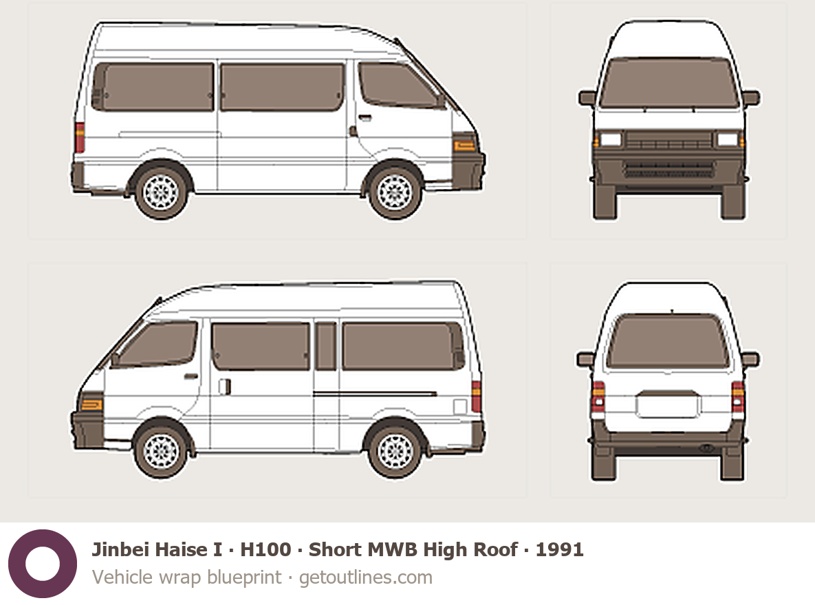 This 1991 Jinbei Haise I H100 Short MWB High Roof Wagon blueprint helps designers, wrap studios, and 3D artists simplify their workflow and save valuable time for creative work instead of routine tasks.