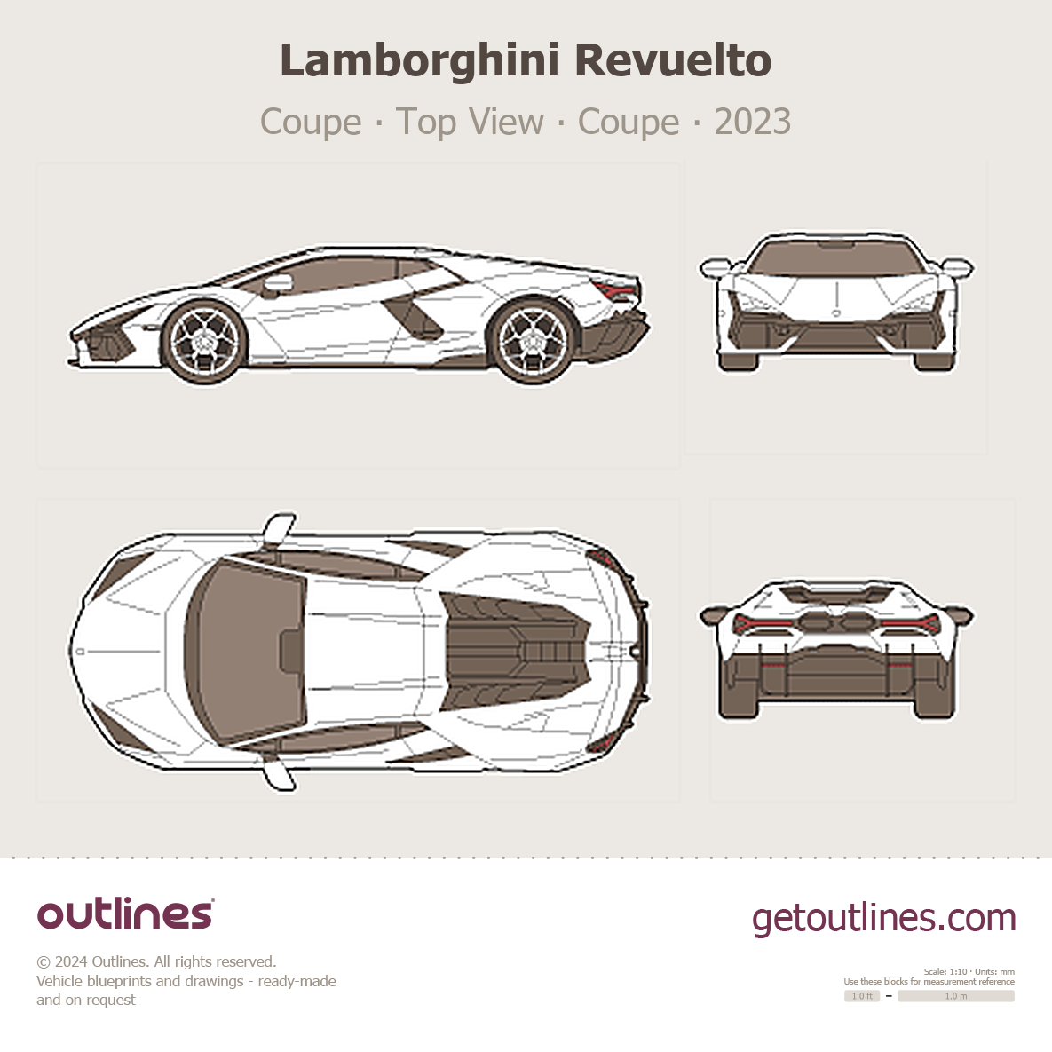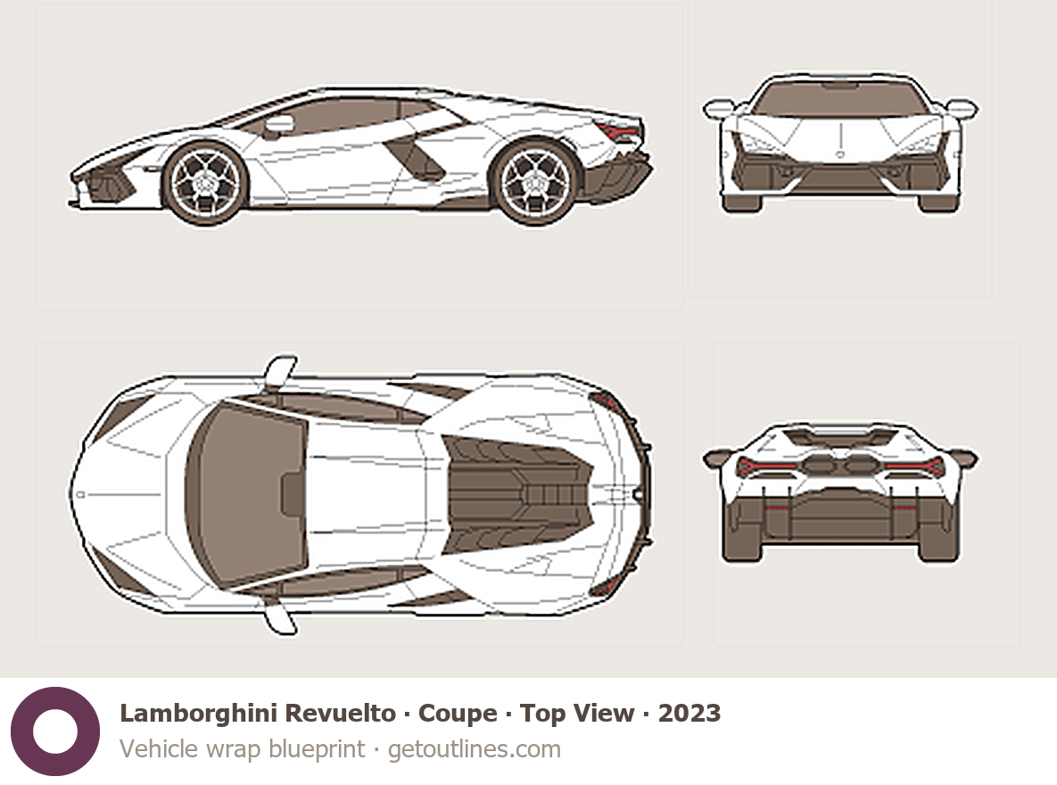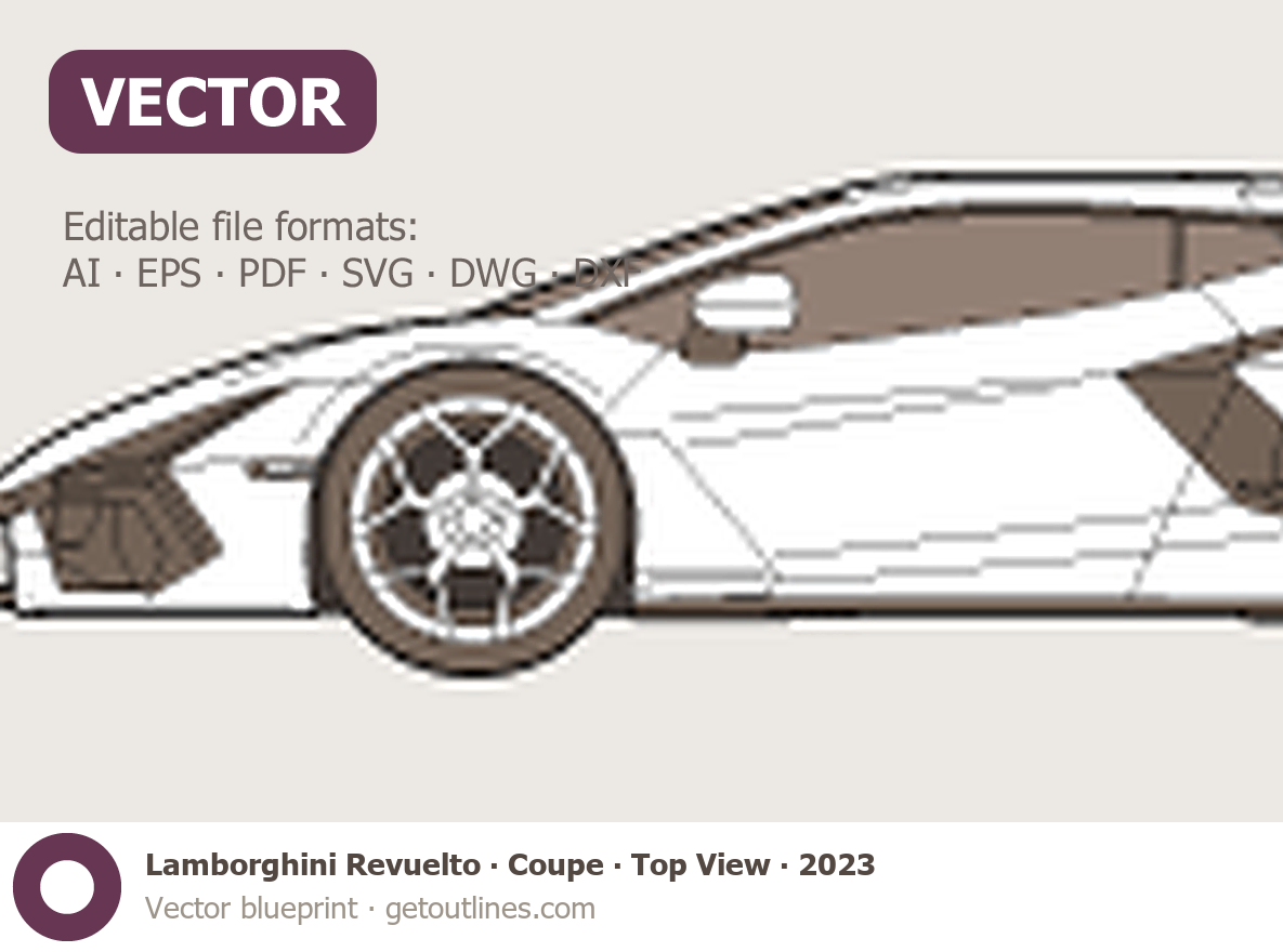 Buy this Lamborghini Revuelto Coupe blueprint and line drawing in high-quality editable vector file formats. Best for 3D and car wrap design.