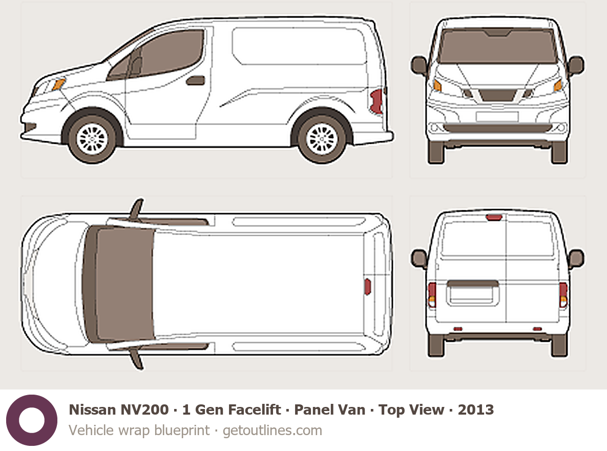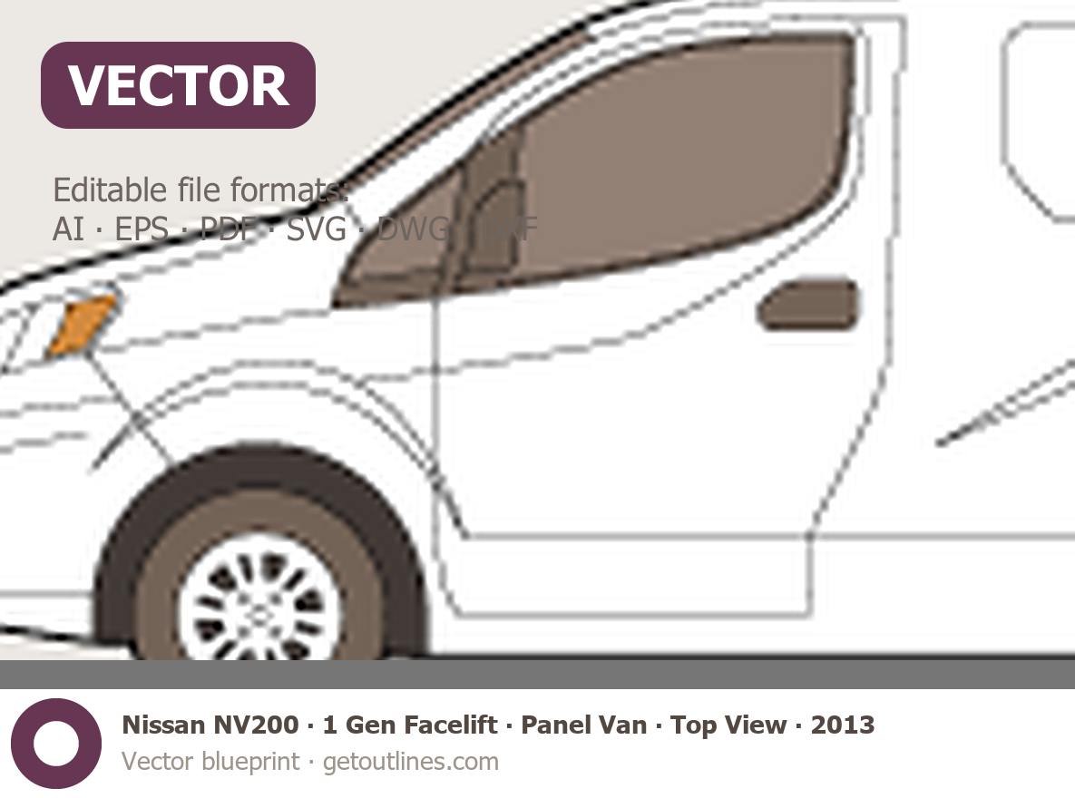 This 2013 Nissan NV200 1 Gen Facelift Panel Van ∙ Top View Van blueprint helps designers, wrap studios, and 3D artists simplify their workflow and save valuable time for creative work instead of routine tasks.