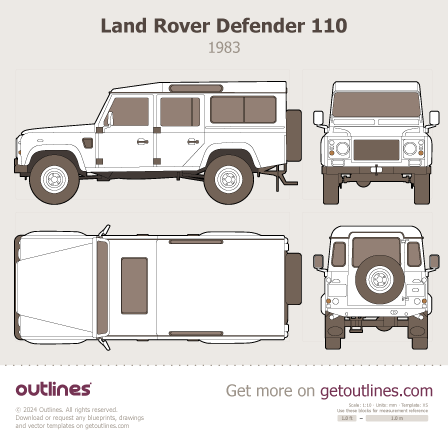 Buy this Land Rover Defender 110 blueprint and line drawing in high-quality editable vector file formats. Best for 3D and car wrap design.