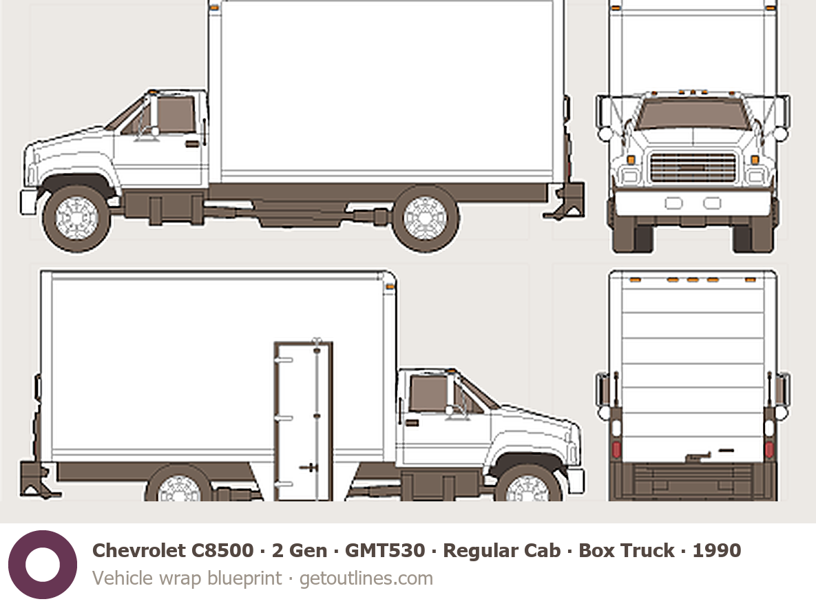 This 1990 Chevrolet C8500 2 Gen ∙ GMT530 Regular Cab ∙ Box Truck Heavy Truck blueprint helps designers, wrap studios, and 3D artists simplify their workflow and save valuable time for creative work instead of routine tasks.