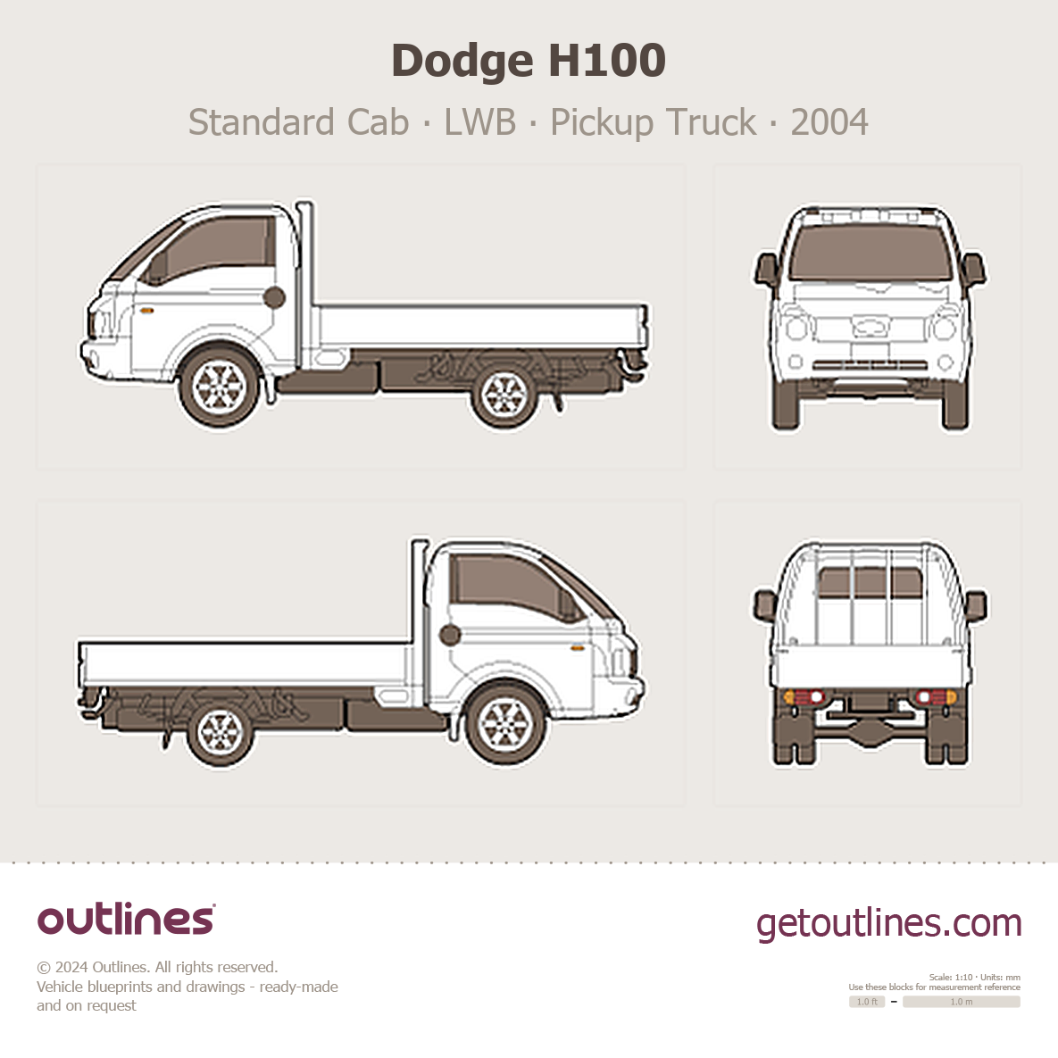 This is a blueprint of the H100, produced by carmaker Dodge in 2004 - 2025. It features a Pickup Truck body design and is classified as a Commercial vehicle.