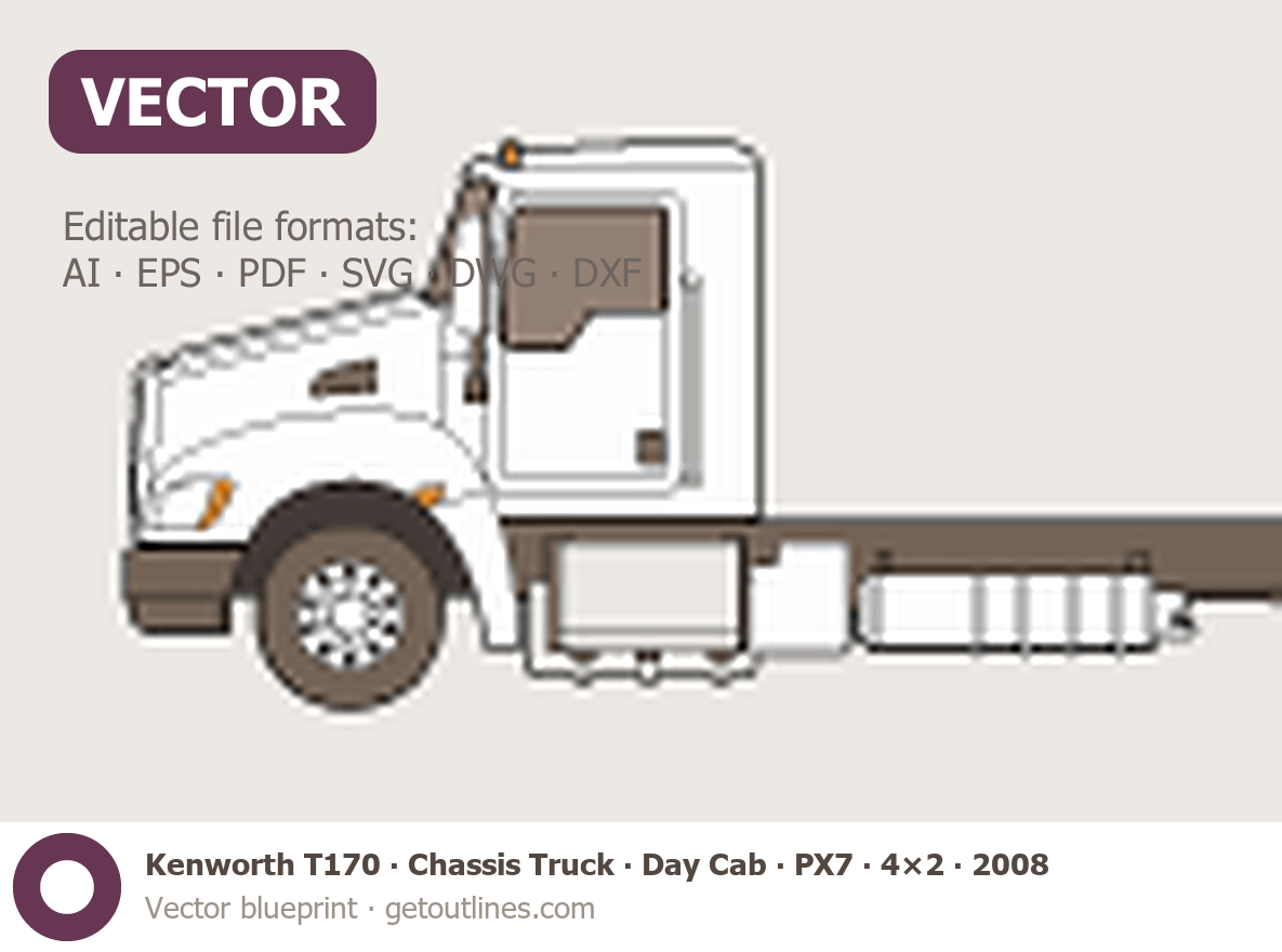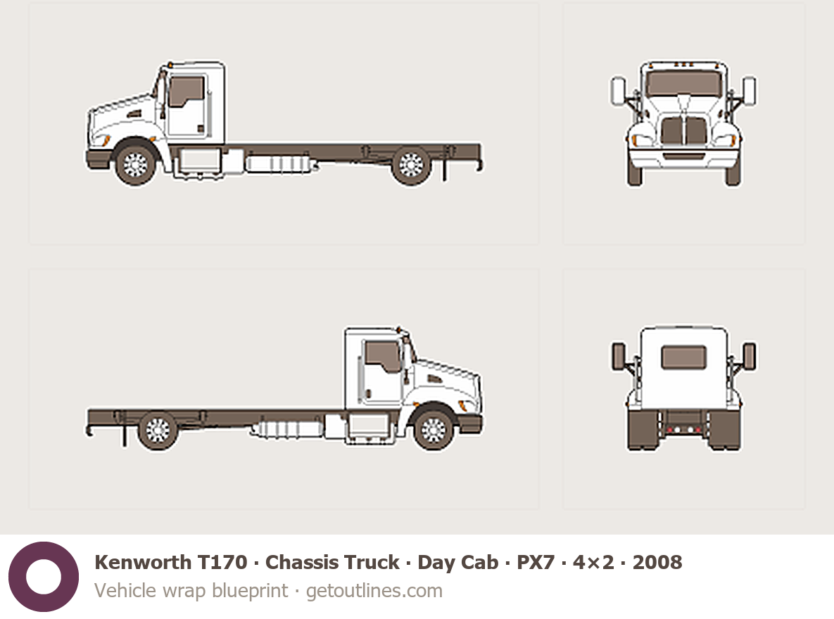 This 2008 Kenworth T170 Chassis Truck ∙ Day Cab ∙ PX7 ∙ 4×2 Heavy Truck blueprint helps designers, wrap studios, and 3D artists simplify their workflow and save valuable time for creative work instead of routine tasks.