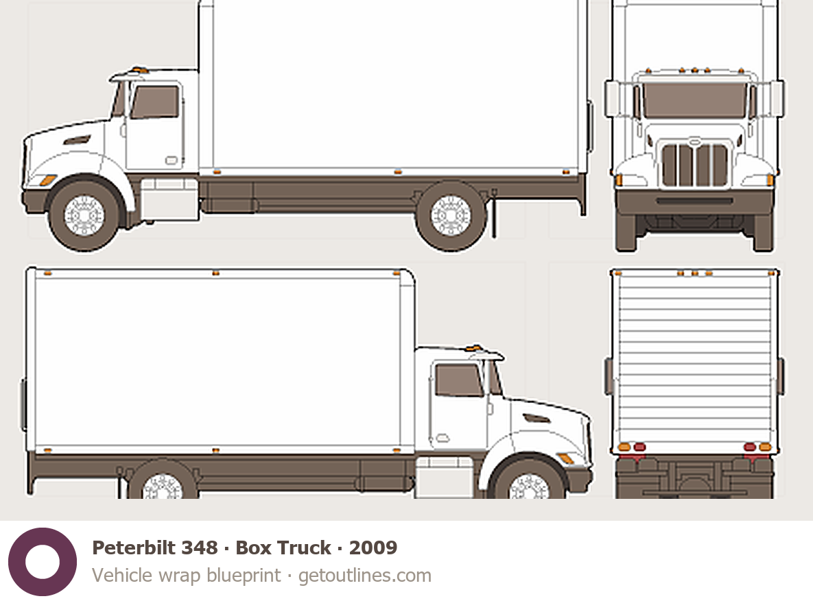This 2009 Peterbilt 348 Box Truck Heavy Truck blueprint helps designers, wrap studios, and 3D artists simplify their workflow and save valuable time for creative work instead of routine tasks.