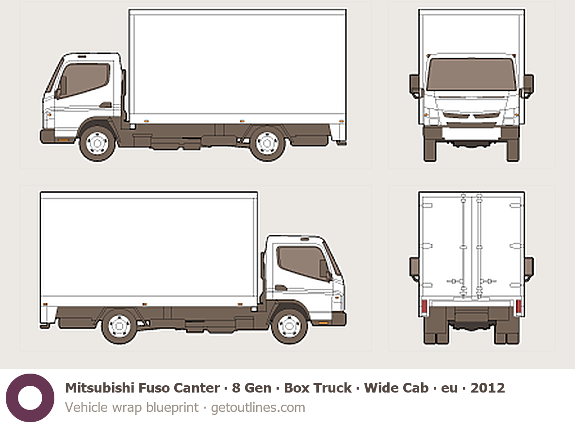 This 2012 Mitsubishi Fuso Canter 8 Gen Box Truck ∙ Wide Cab ∙ eu Heavy Truck blueprint helps designers, wrap studios, and 3D artists simplify their workflow and save valuable time for creative work instead of routine tasks.