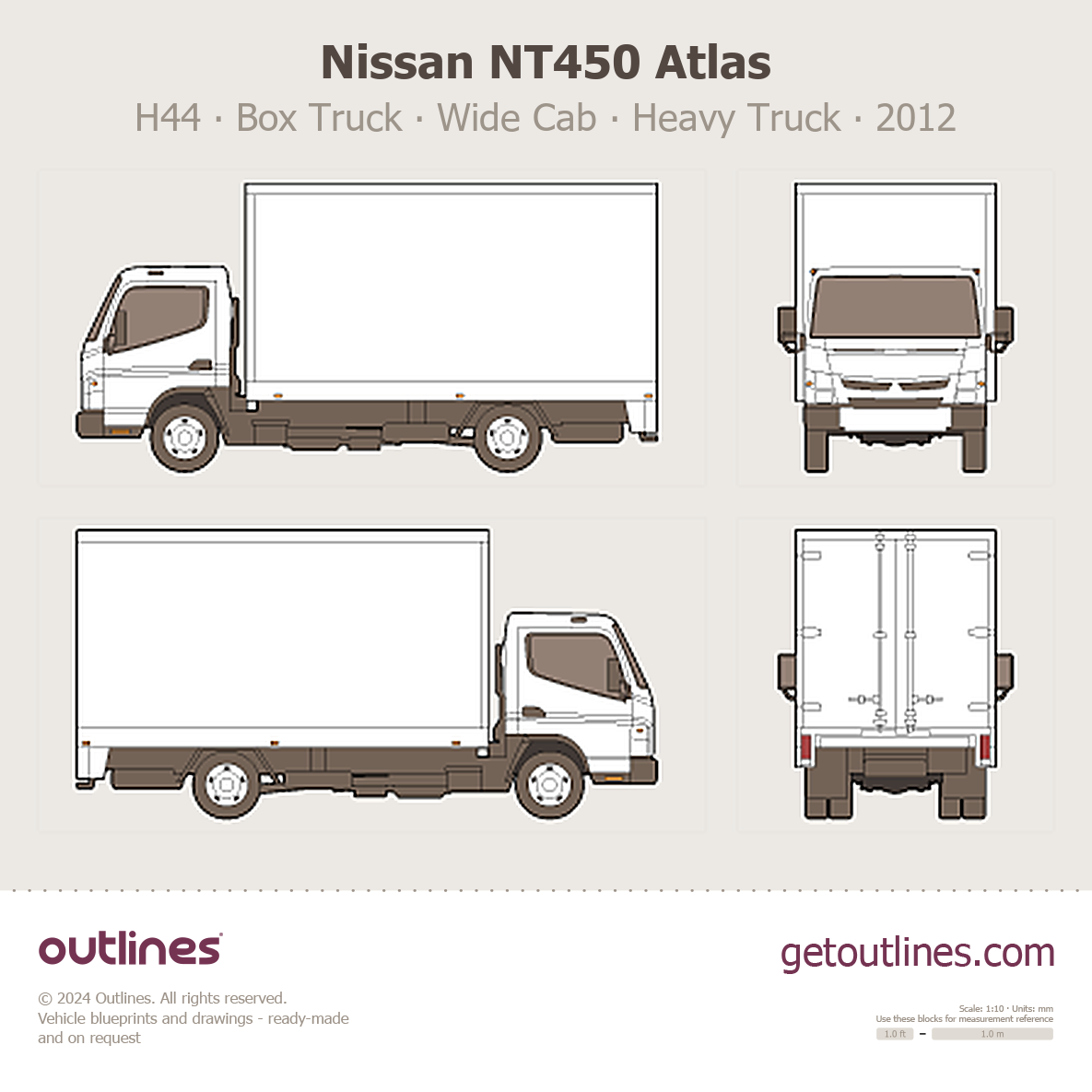 This 2012 Nissan NT450 Atlas H44 Box Truck ∙ Wide Cab Heavy Truck blueprint helps designers, wrap studios, and 3D artists simplify their workflow and save valuable time for creative work instead of routine tasks.