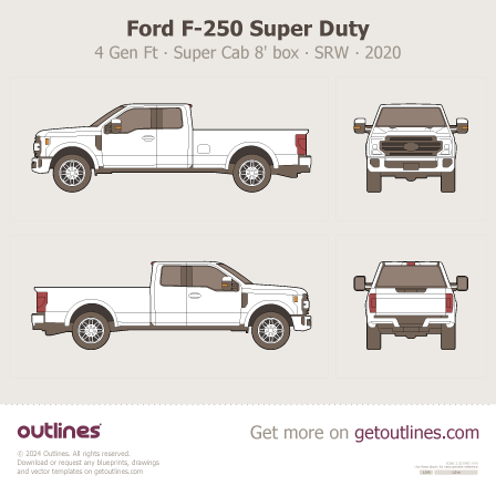 Buy this Ford F-250 Super Duty 4 Gen Facelift '20 blueprint and line drawing in high-quality editable vector file formats. Best for 3D and car wrap design.