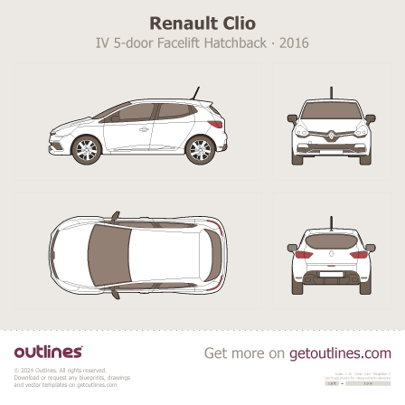 Buy this Renault Clio IV Facelift blueprint and line drawing in high-quality editable vector file formats. Best for 3D and car wrap design.