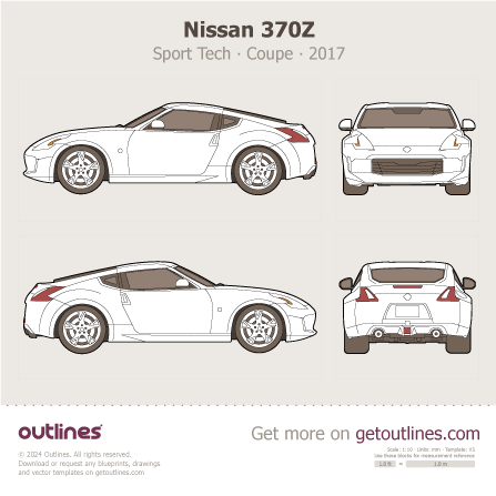 Buy this Nissan 370Z blueprint and line drawing in high-quality editable vector file formats. Best for 3D and car wrap design.