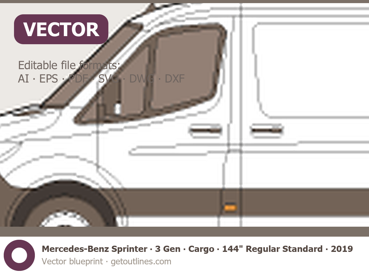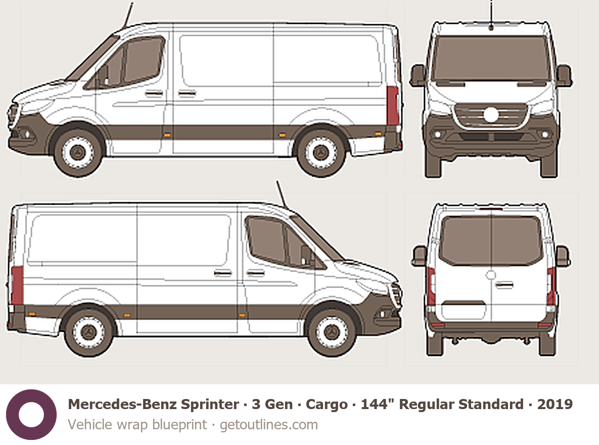 This 2019 Mercedes-Benz Sprinter 3 Gen ∙ Cargo 144" Regular Standard Roof Van blueprint helps designers, wrap studios, and 3D artists simplify their workflow and save valuable time for creative work instead of routine tasks.