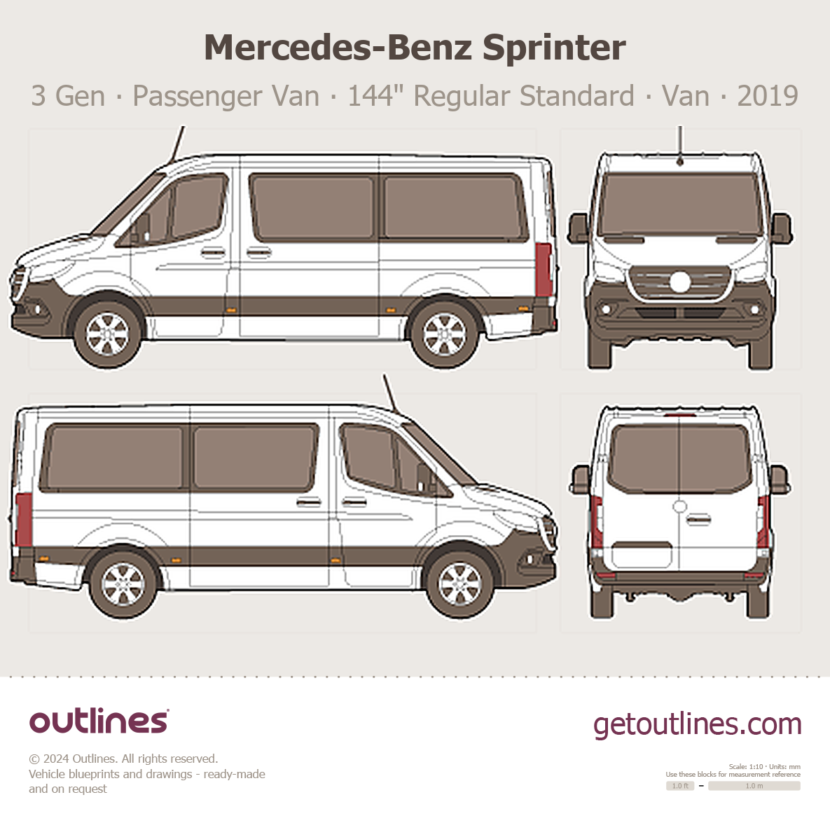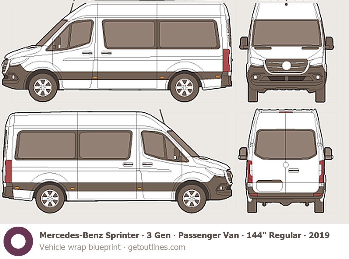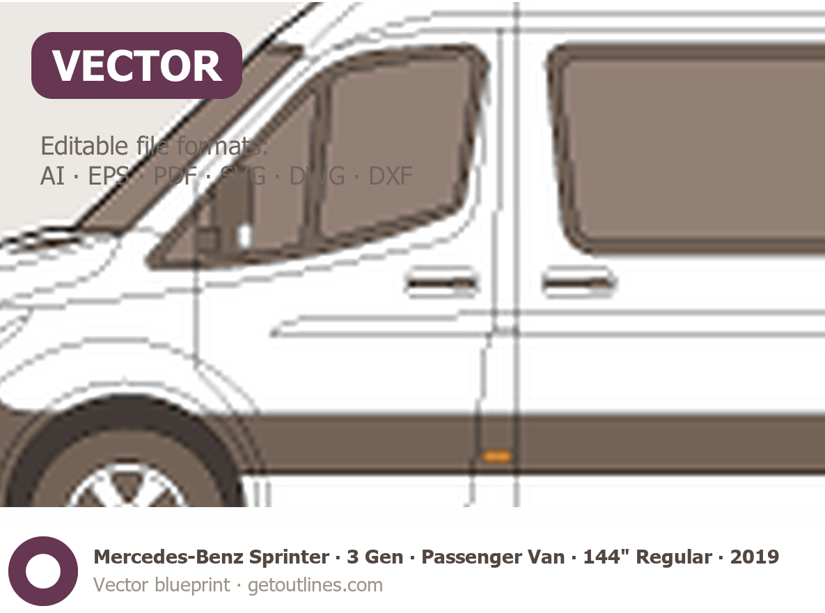 This 2019 Mercedes-Benz Sprinter 3 Gen ∙ Passenger Van 144" Regular Standard Roof Van blueprint helps designers, wrap studios, and 3D artists simplify their workflow and save valuable time for creative work instead of routine tasks.