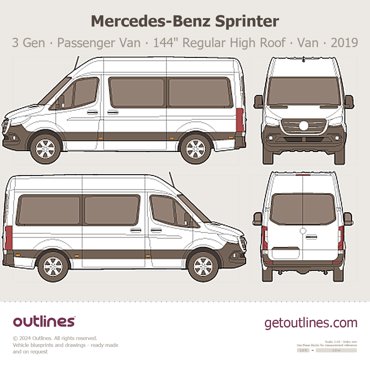 This 2019 Mercedes-Benz Sprinter 3 Gen ∙ Passenger Van 144" Regular High Roof Van blueprint helps designers, wrap studios, and 3D artists simplify their workflow and save valuable time for creative work instead of routine tasks.