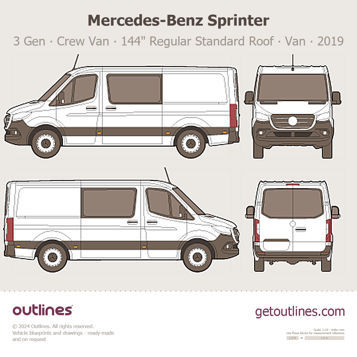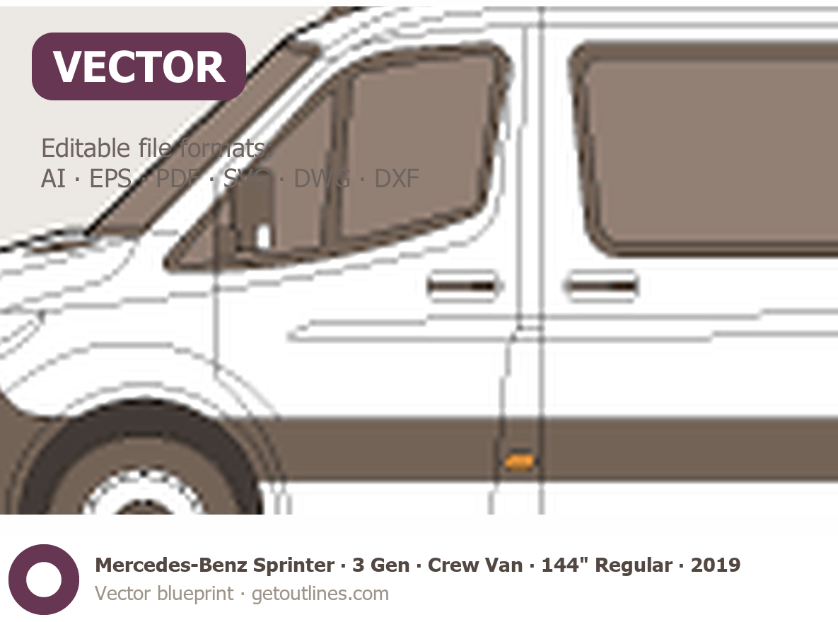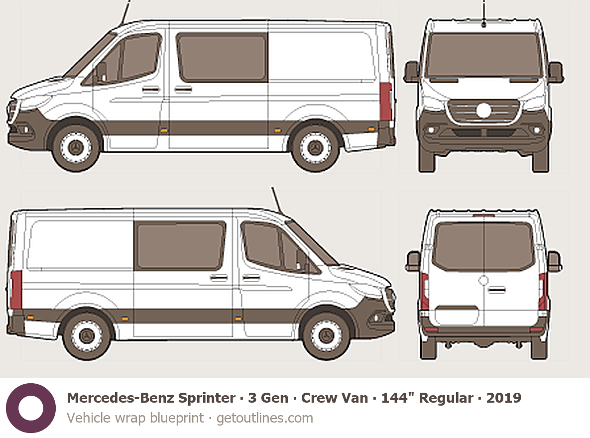 This 2019 Mercedes-Benz Sprinter 3 Gen ∙ Crew Van 144" Regular Standard Roof Van blueprint helps designers, wrap studios, and 3D artists simplify their workflow and save valuable time for creative work instead of routine tasks.
