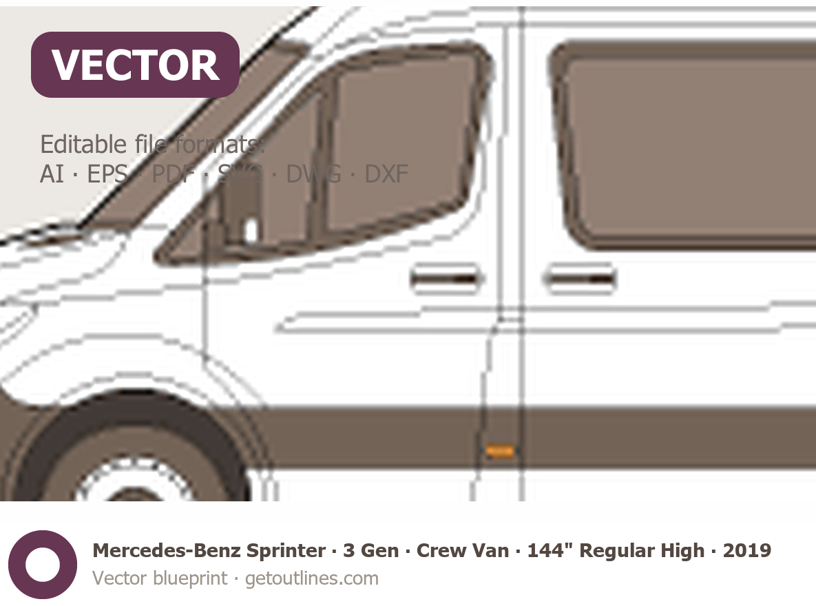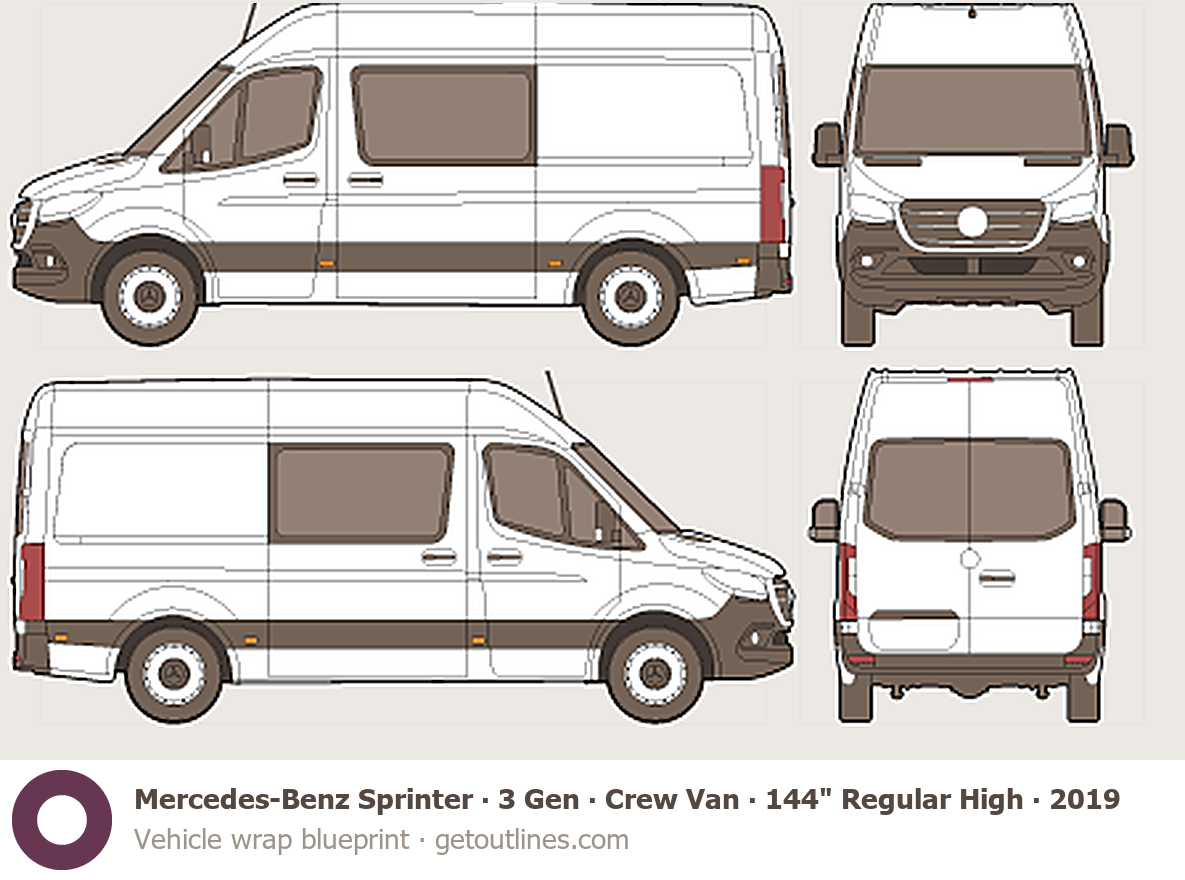 This 2019 Mercedes-Benz Sprinter 3 Gen ∙ Crew Van 144" Regular High Roof Van blueprint helps designers, wrap studios, and 3D artists simplify their workflow and save valuable time for creative work instead of routine tasks.