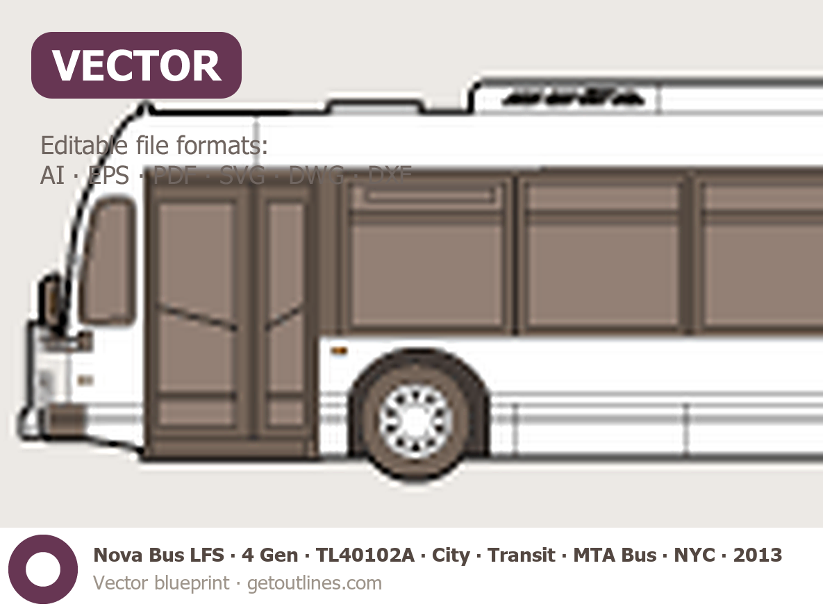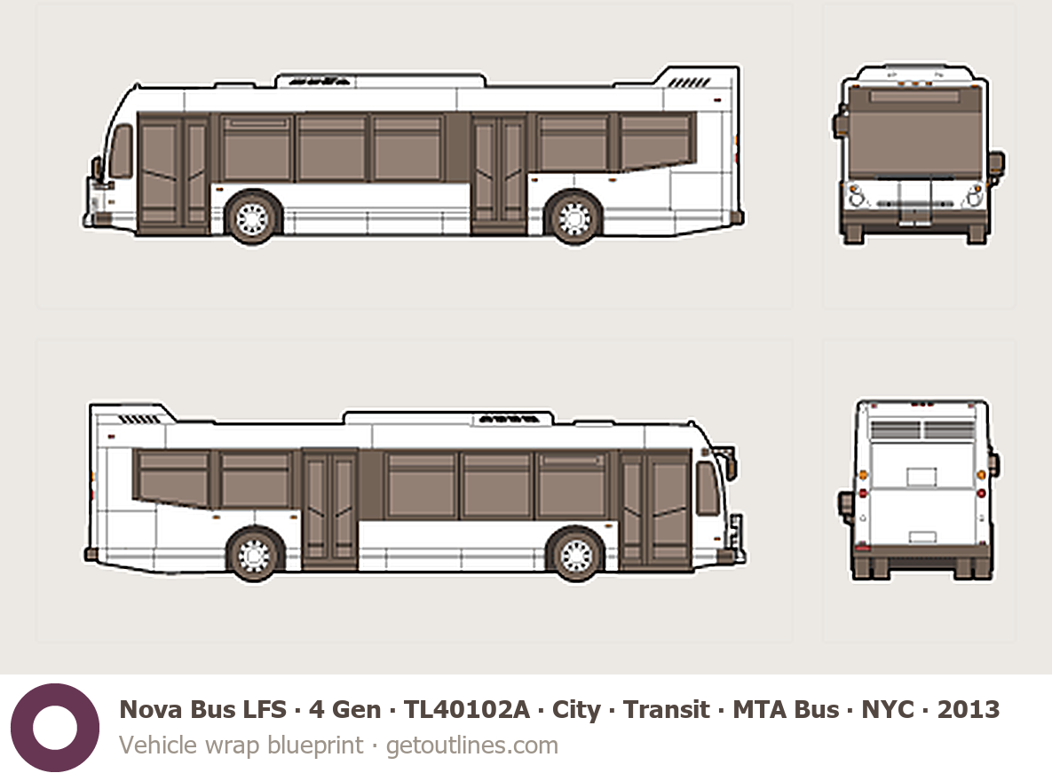 This 2013 Nova Bus LFS 4 Gen Low Floor Series ∙ TL40102A ∙ City ∙ Transit ∙ MTA Bus ∙ NYC ∙ Quebec Bus blueprint helps designers, wrap studios, and 3D artists simplify their workflow and save valuable time for creative work instead of routine tasks.