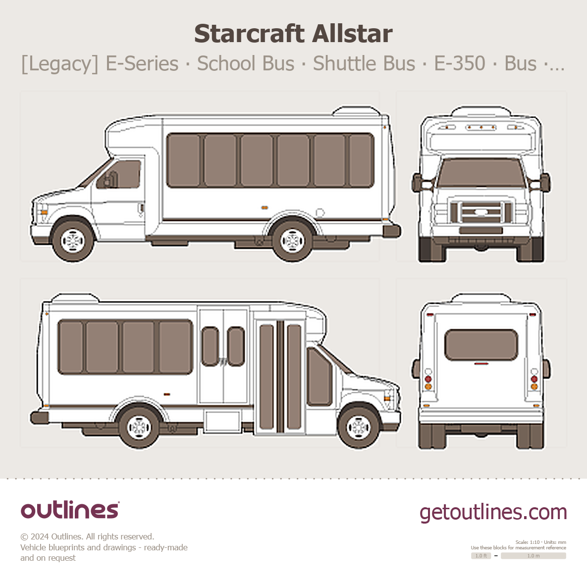 This 2008 Starcraft Allstar [Legacy] E-Series ∙ School Bus ∙ Shuttle Bus E-350 ∙ E-450 ∙ LWB ∙ Type A ∙ Quest 30 ∙ eQuest ∙ MFSAB Bus blueprint helps designers, wrap studios, and 3D artists simplify their workflow and save valuable time for creative work instead of routine tasks.