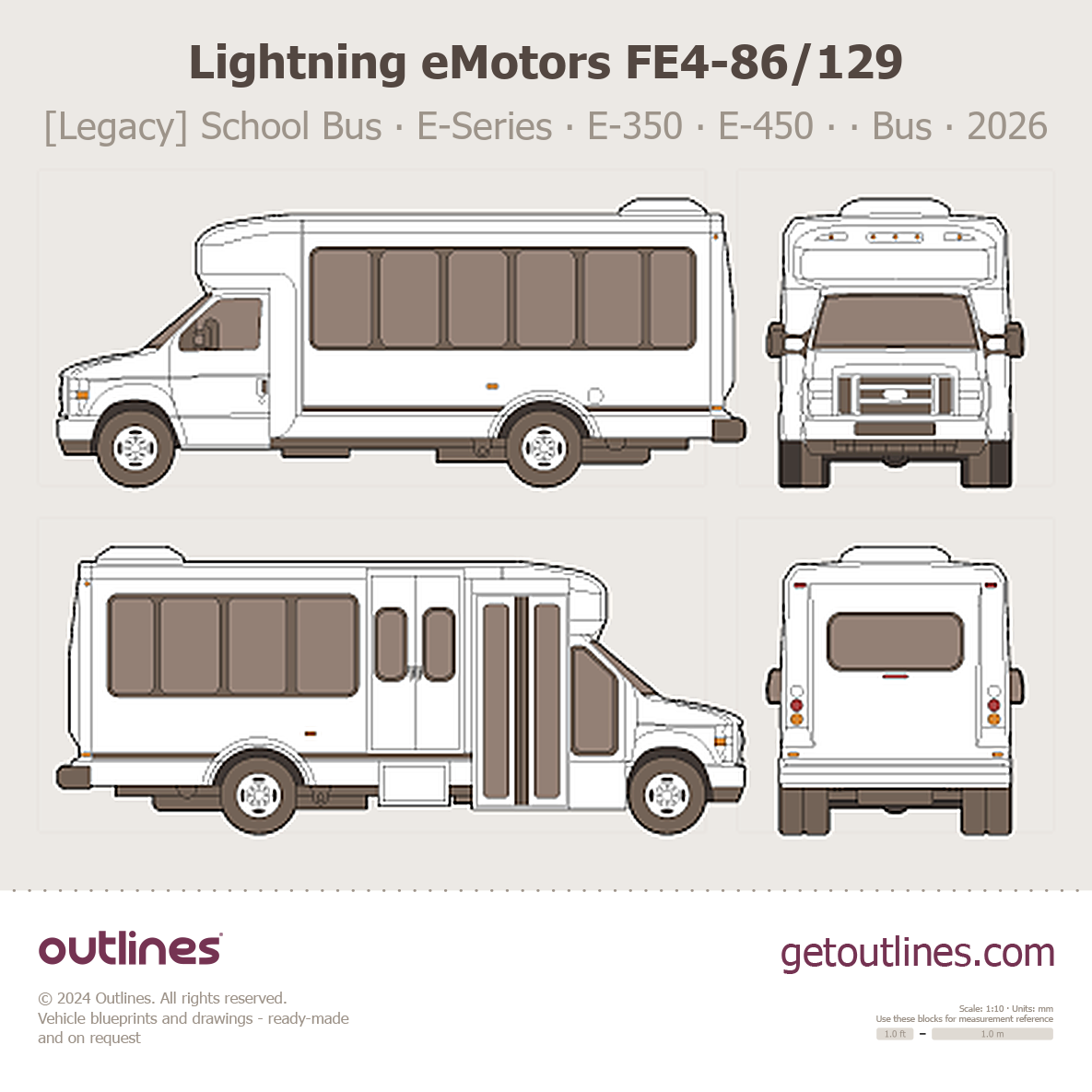 Buy this Lightning eMotors FE4-86/129 [Legacy] School Bus ∙ Shuttle ∙ E-Series blueprint and line drawing in high-quality editable vector file formats. Best for 3D and car wrap design.