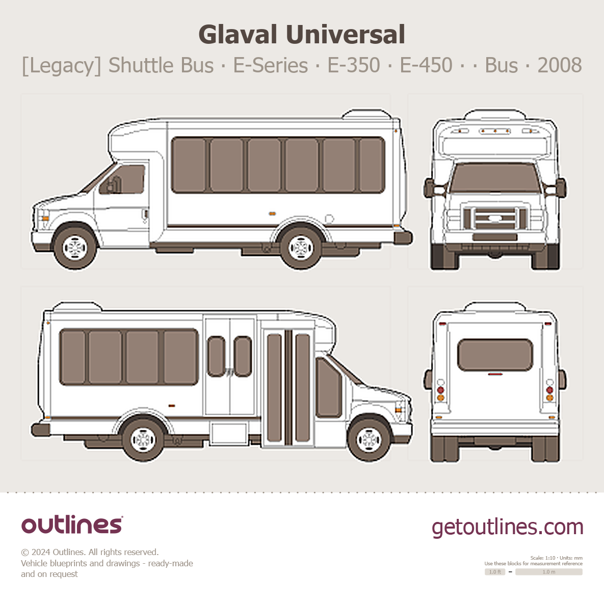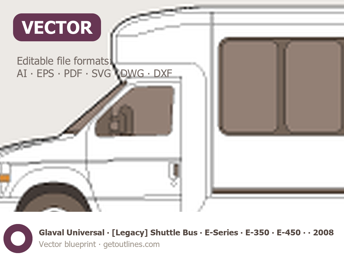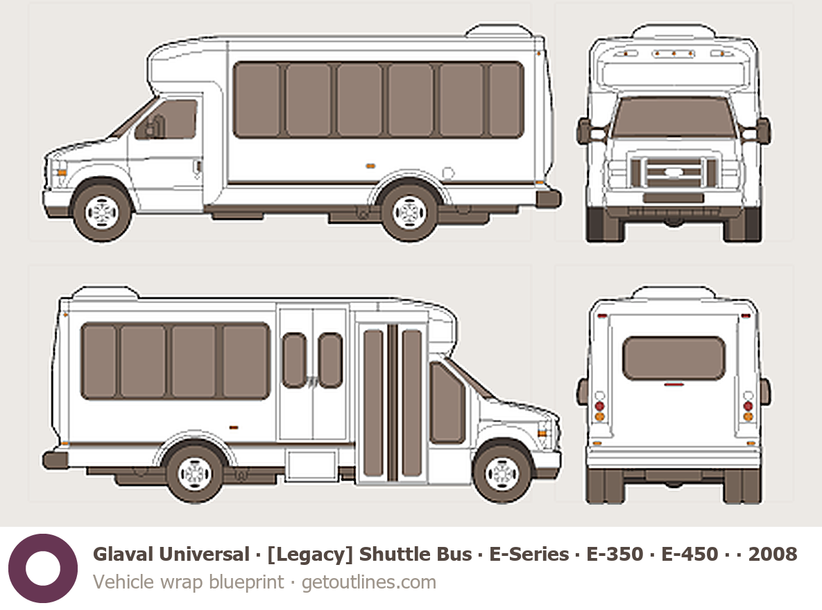 This 2008 Glaval Universal [Legacy] Shuttle Bus ∙ E-Series E-350 ∙ E-450 ∙ LWB Bus blueprint helps designers, wrap studios, and 3D artists simplify their workflow and save valuable time for creative work instead of routine tasks.