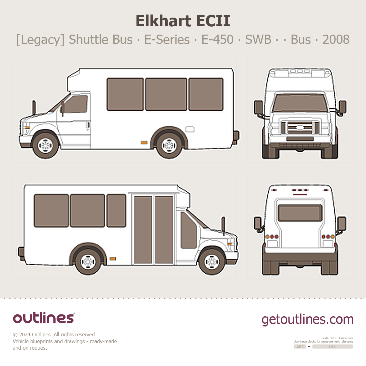 This 2008 Elkhart ECII [Legacy] Shuttle Bus ∙ E-Series E-450 ∙ SWB ∙ Coach Bus blueprint helps designers, wrap studios, and 3D artists simplify their workflow and save valuable time for creative work instead of routine tasks.