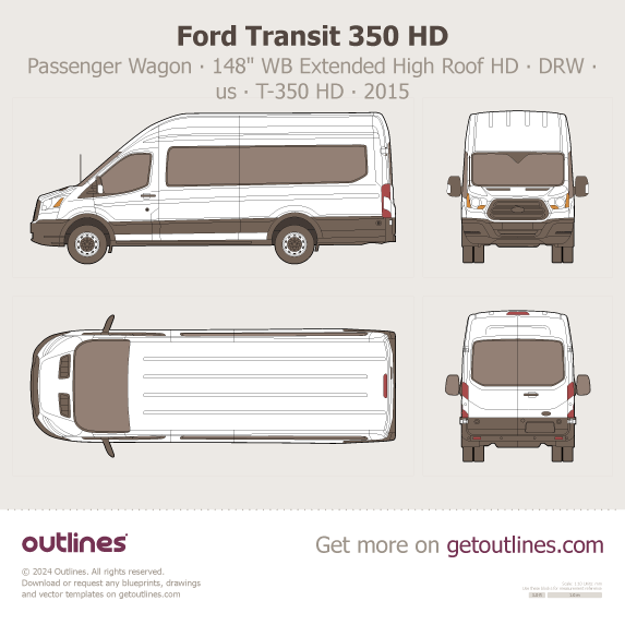 Buy this Ford Transit 350 HD Passenger Wagon blueprint and line drawing in high-quality editable vector file formats. Best for 3D and car wrap design.