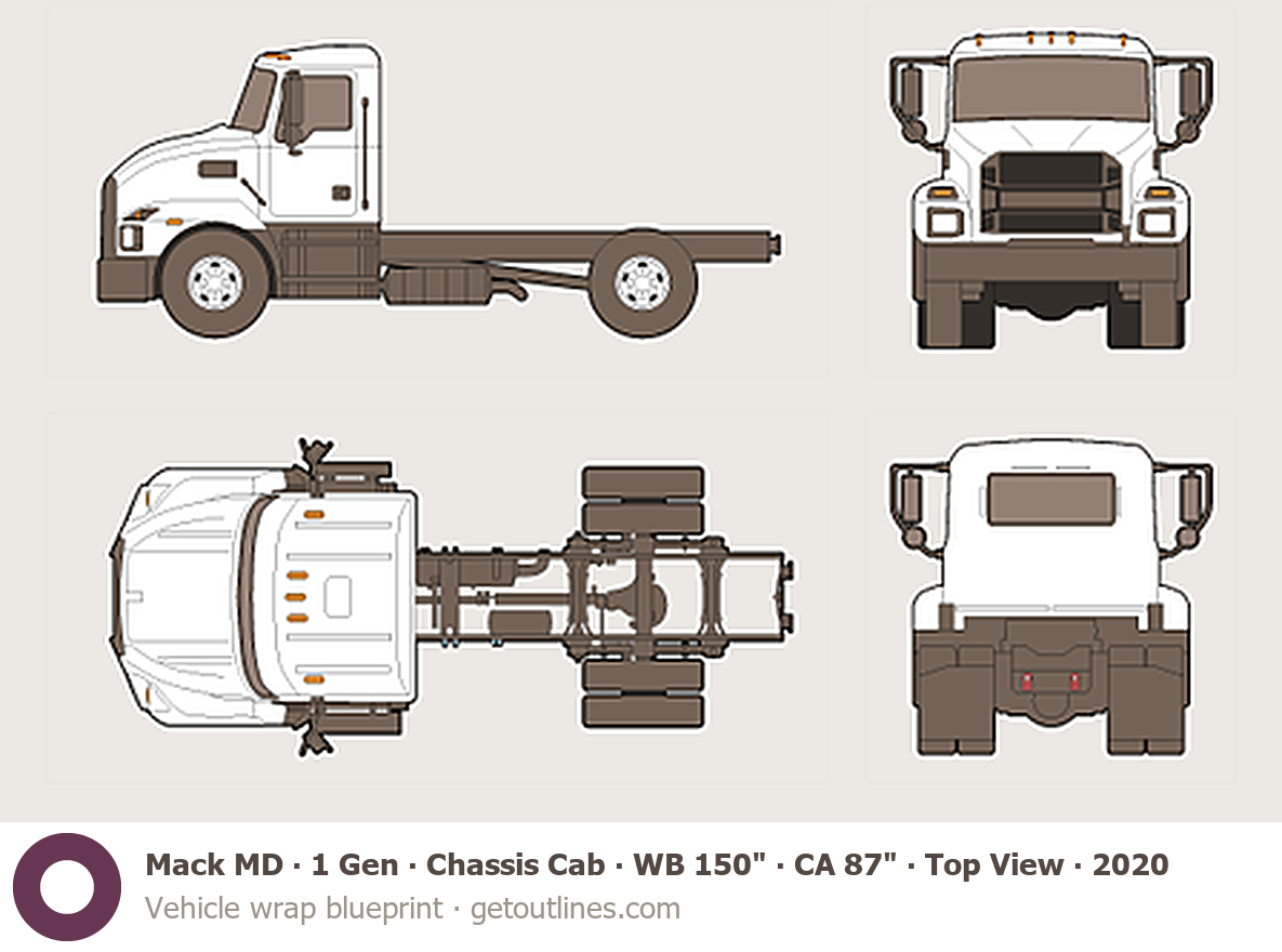 This 2020 Mack MD 1 Gen Chassis Cab ∙ WB 150" ∙ CA 87" ∙ Top View Heavy Truck blueprint helps designers, wrap studios, and 3D artists simplify their workflow and save valuable time for creative work instead of routine tasks.