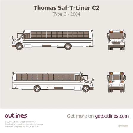 This 2004 Thomas Saf-T-Liner C2 Type C ∙ School Bus ∙ CNG ∙ Electric ∙ C2 Jouley Bus blueprint helps designers, wrap studios, and 3D artists simplify their workflow and save valuable time for creative work instead of routine tasks.