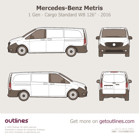This 2016 Mercedes-Benz Metris 1 Gen ∙ Cargo Standard WB 126" Van blueprint helps designers, wrap studios, and 3D artists simplify their workflow and save valuable time for creative work instead of routine tasks.