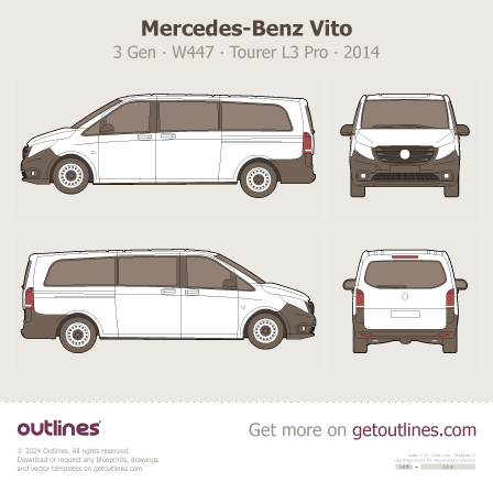 This 2014 Mercedes-Benz Vito 3 Gen ∙ W447 ∙ Tourer L3 Pro Wagon blueprint helps designers, wrap studios, and 3D artists simplify their workflow and save valuable time for creative work instead of routine tasks.