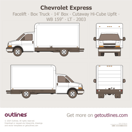 This 2003 Chevrolet Express 3500 Box Truck ∙ Facelift '03 14' Box ∙ Cutaway Hi-Cube Upfit ∙ WB 159" ∙ LT ∙ G3500 Heavy Truck blueprint helps designers, wrap studios, and 3D artists simplify their workflow and save valuable time for creative work instead of routine tasks.