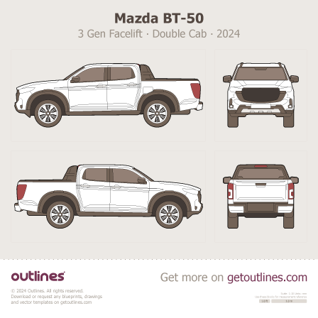 Buy this Mazda BT-50 3 Gen Facelift blueprint and line drawing in high-quality editable vector file formats. Best for 3D and car wrap design.