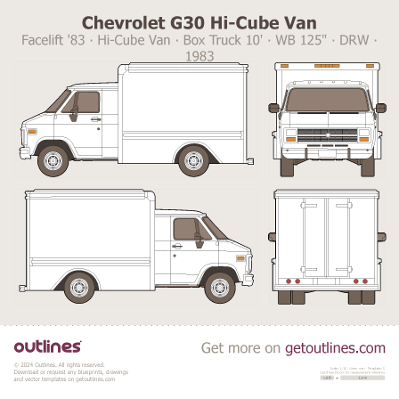 This 1983 Chevrolet G30 Hi-Cube Van ∙ 3 Gen Facelift '83 Box Truck ∙ 10' ∙ WB 125" ∙ DRW ∙ G-Series Heavy Truck blueprint helps designers, wrap studios, and 3D artists simplify their workflow and save valuable time for creative work instead of routine tasks.