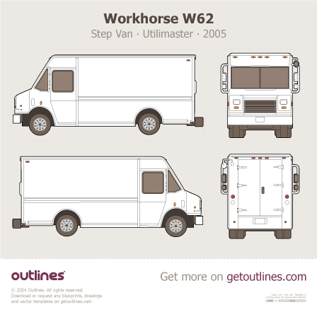 This is a blueprint of the W62, produced by carmaker Workhorse in 2005 - 2012. It features a Van body design and is classified as a Commercial vehicle.